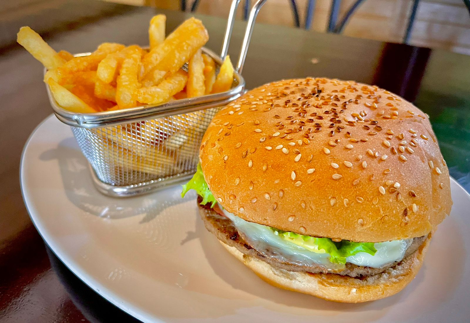 Carne jugosa, queso chedar, lechuga, tomate, cebolla caramelizada, salsa especial, acompañado de papas fritas.