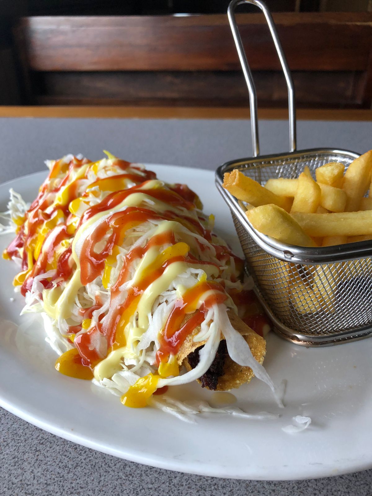 Taco relleno de carne mechada acompañada de fino repollo, mayonesa, salsa de tomate y mostaza.