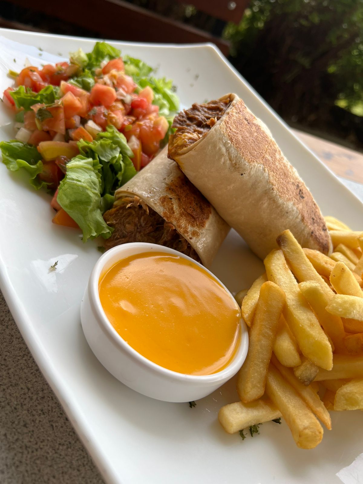 Tortilla de harina gigante rellena con frijoles, queso derretido, carne a eleccion, bañada con queso cheddar y natilla; servido con papas fritas y ensalada