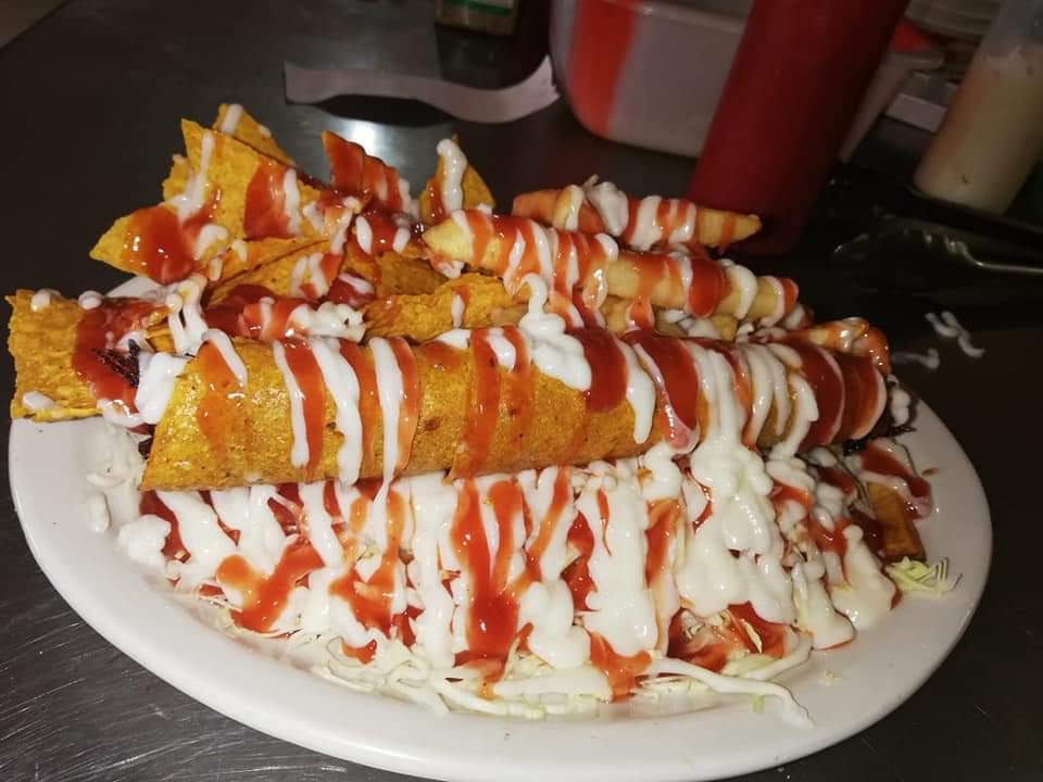 TACO PEQUEÑO, REPOLLO, SALSA DE TOMATE, MAYONESA, TOSTADAS Y PAPAS