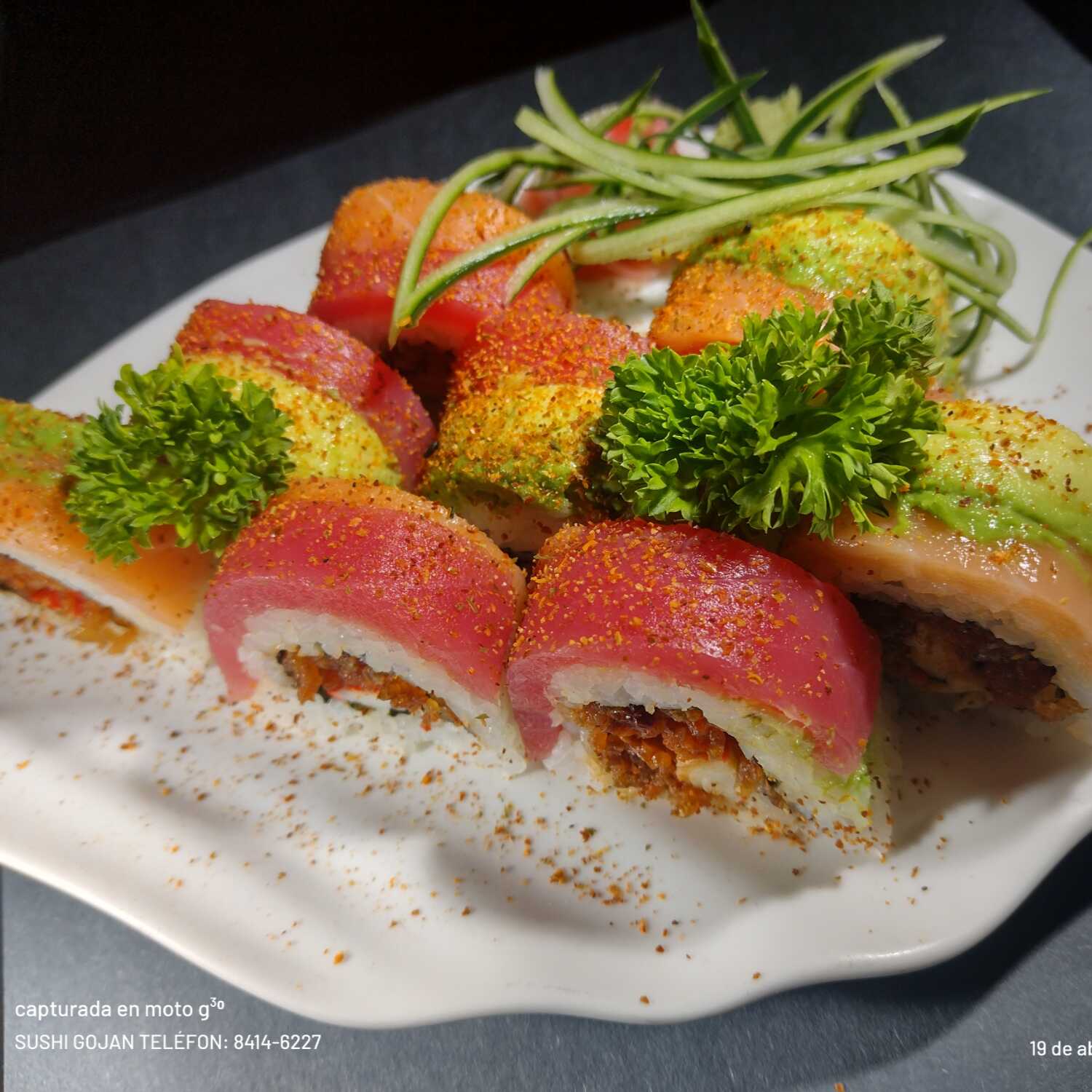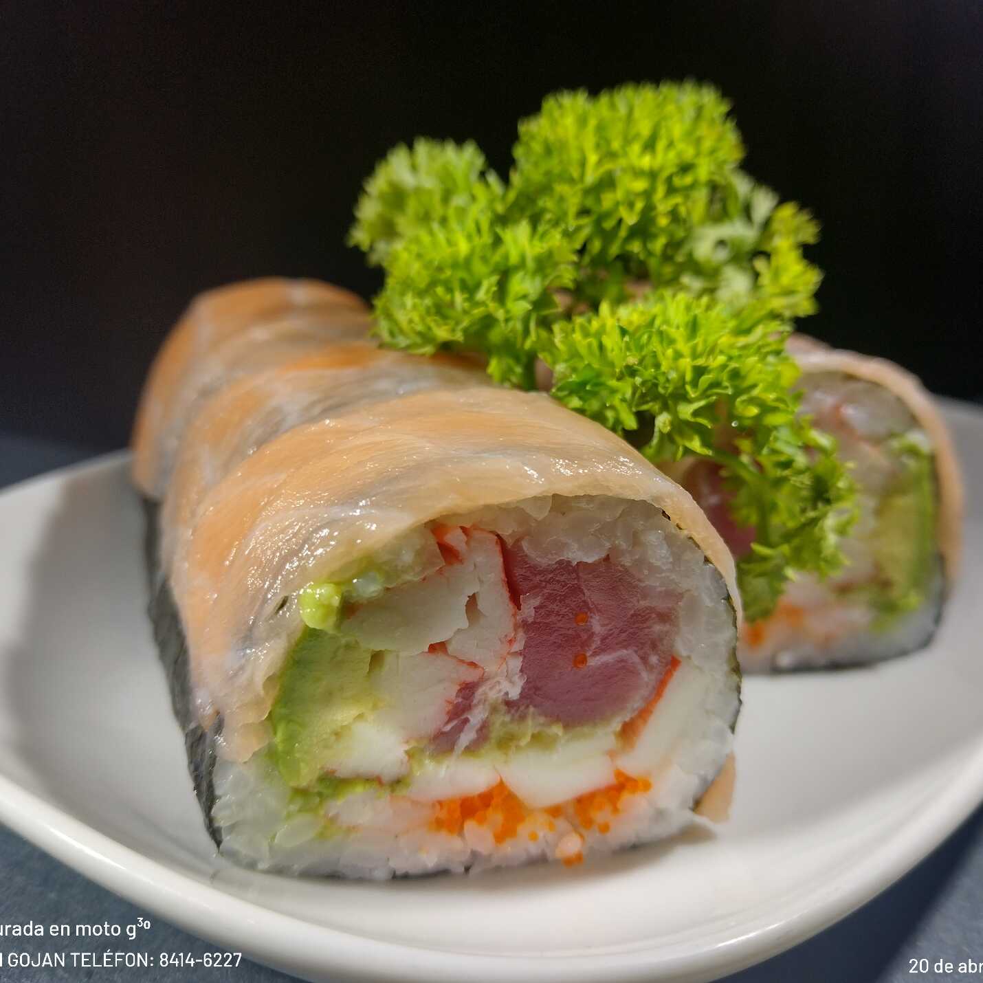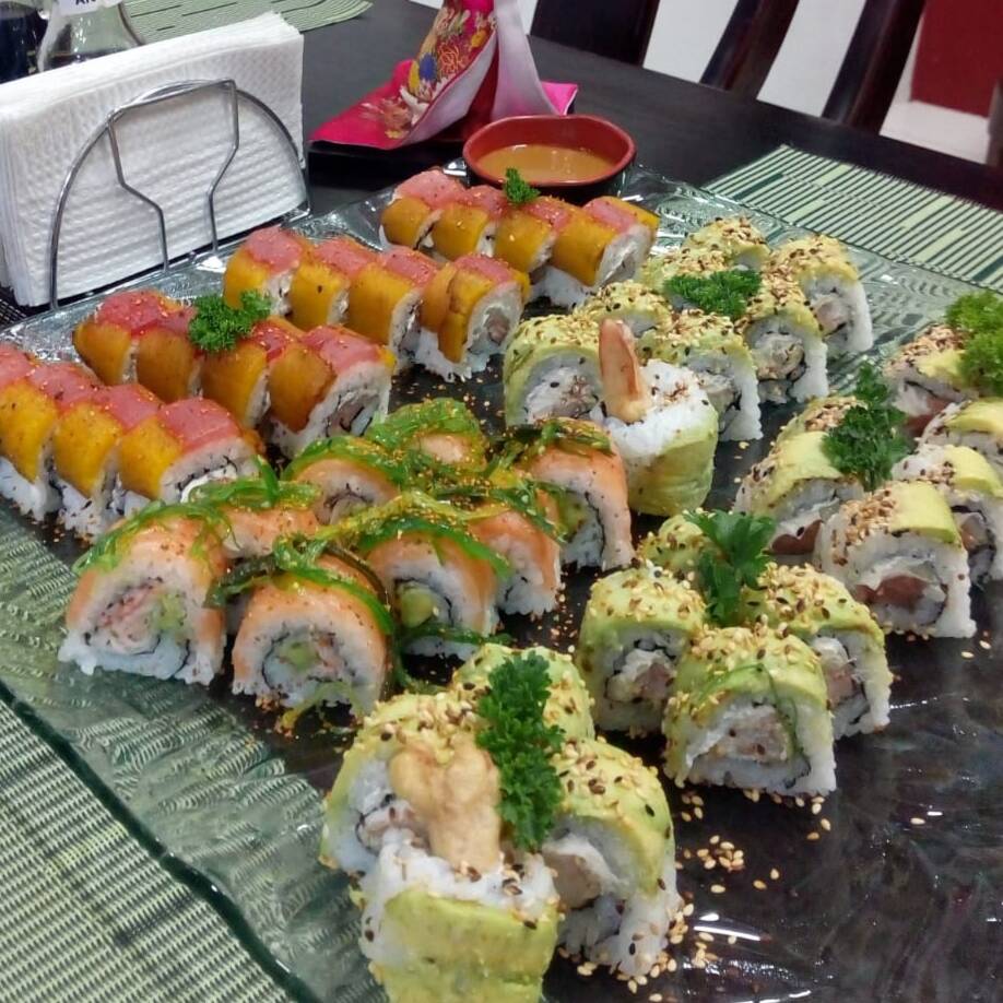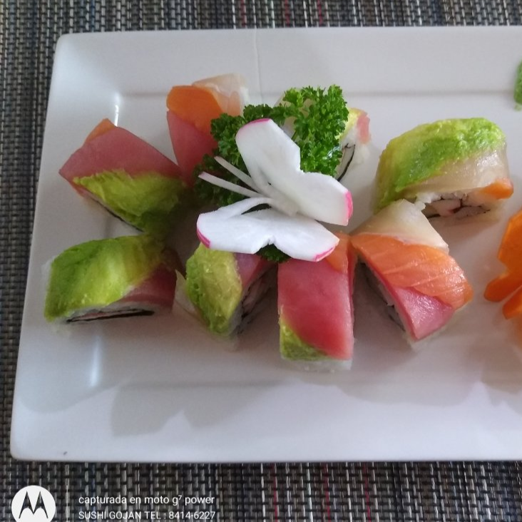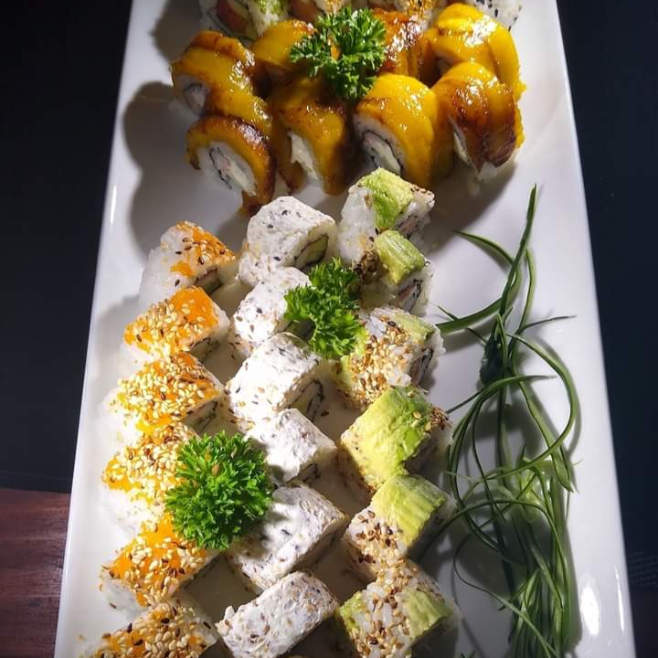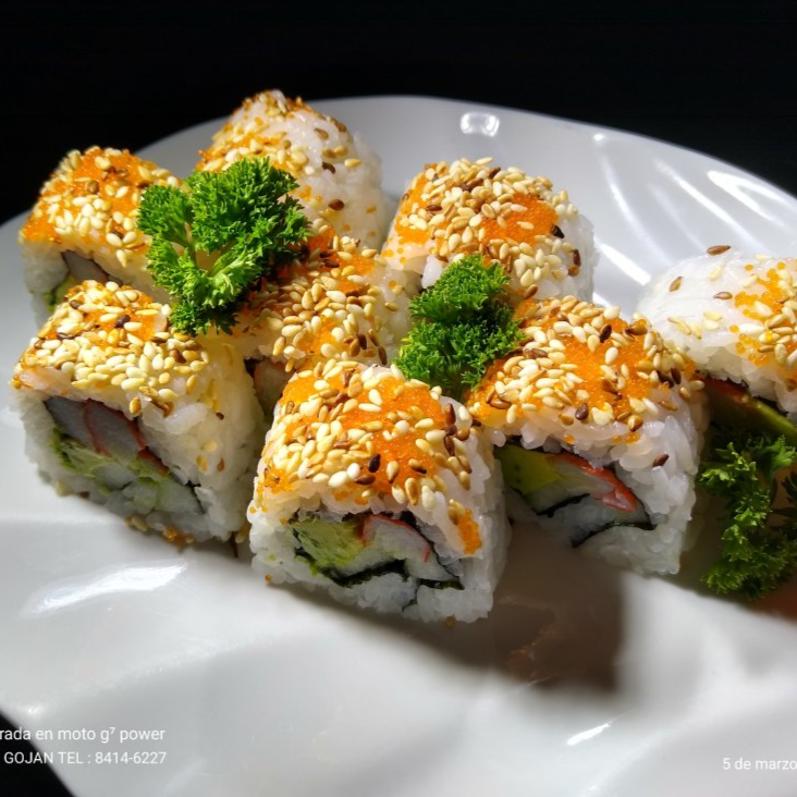 Salmón, masago, aguacate, atún, kanikama, camarón, salsa de soya.