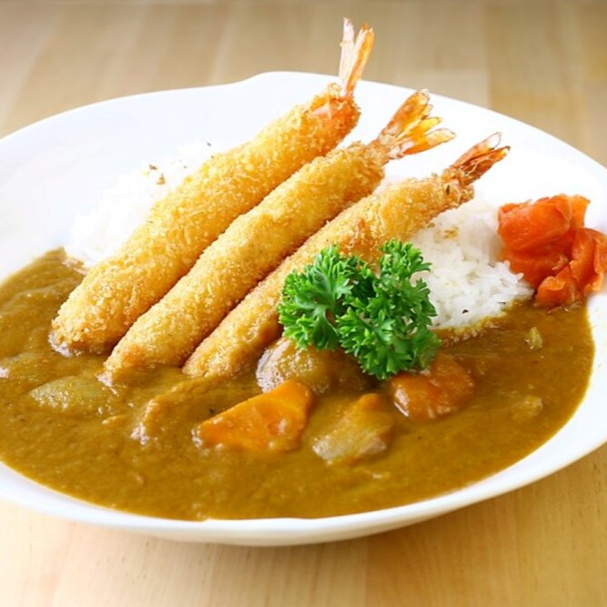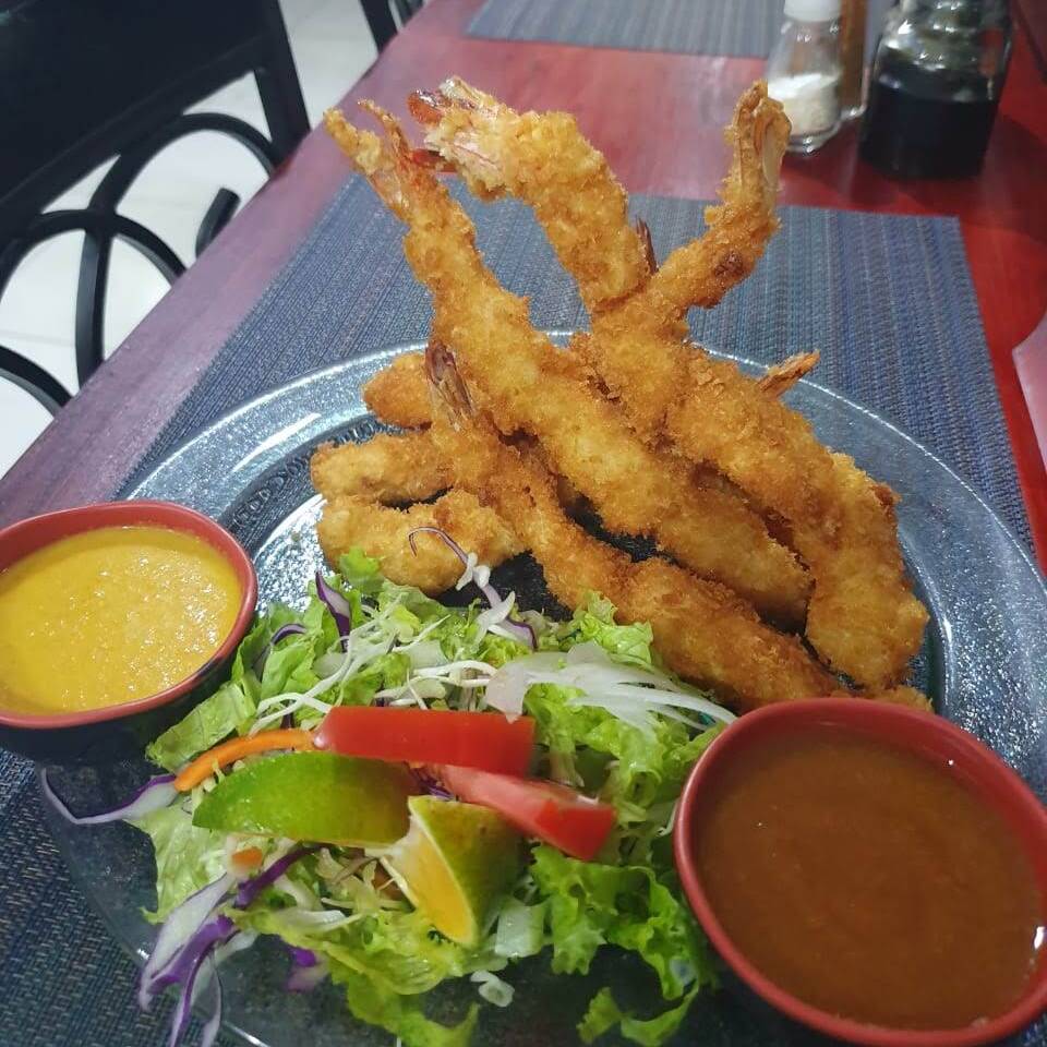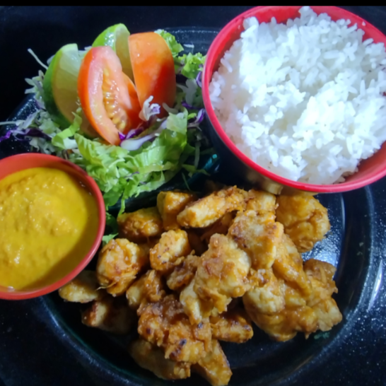 Camarones empanizados, arroz blanco, curry, zanahoria, papa y cebolla.