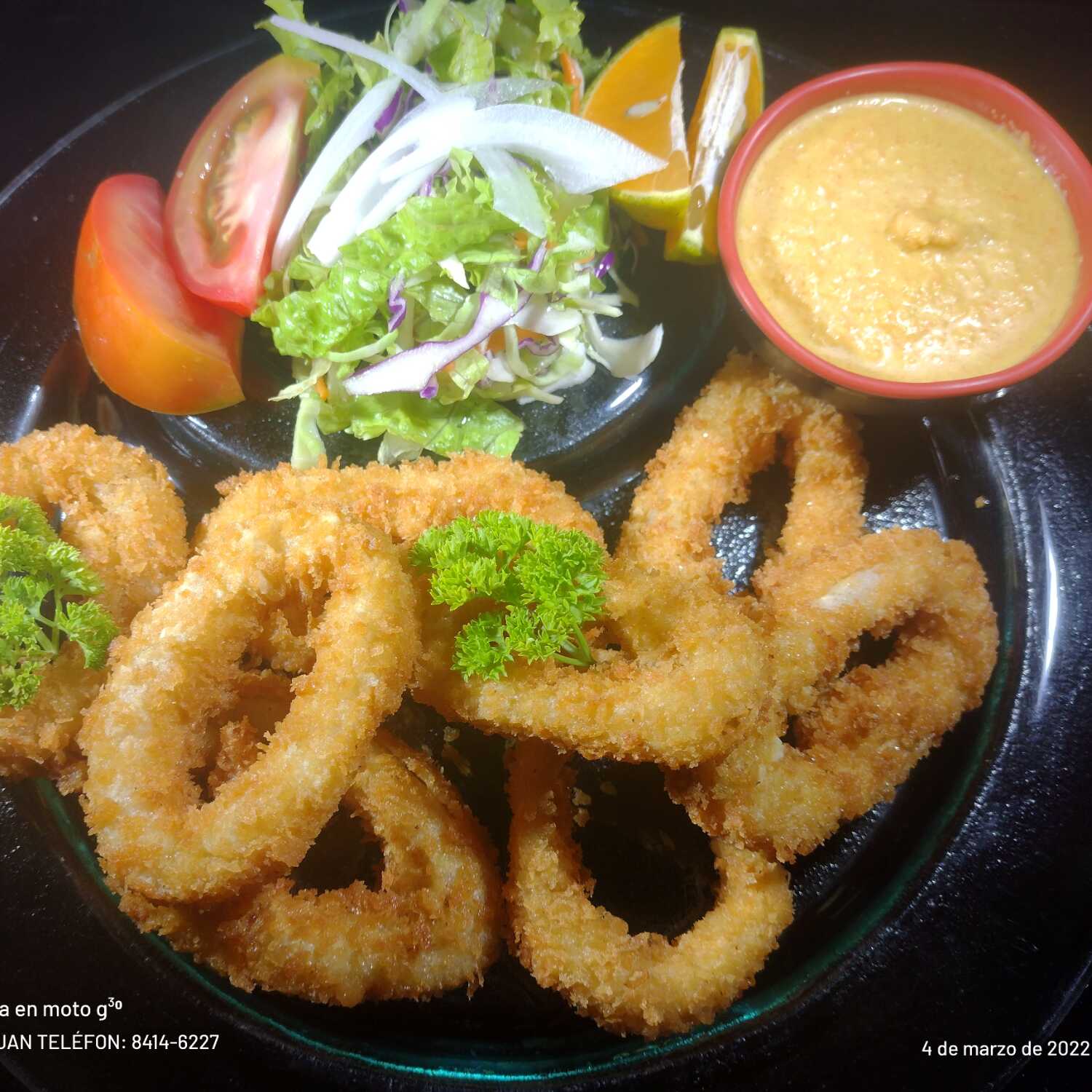 Aritos de calamar empanizado acompañado de ensalada