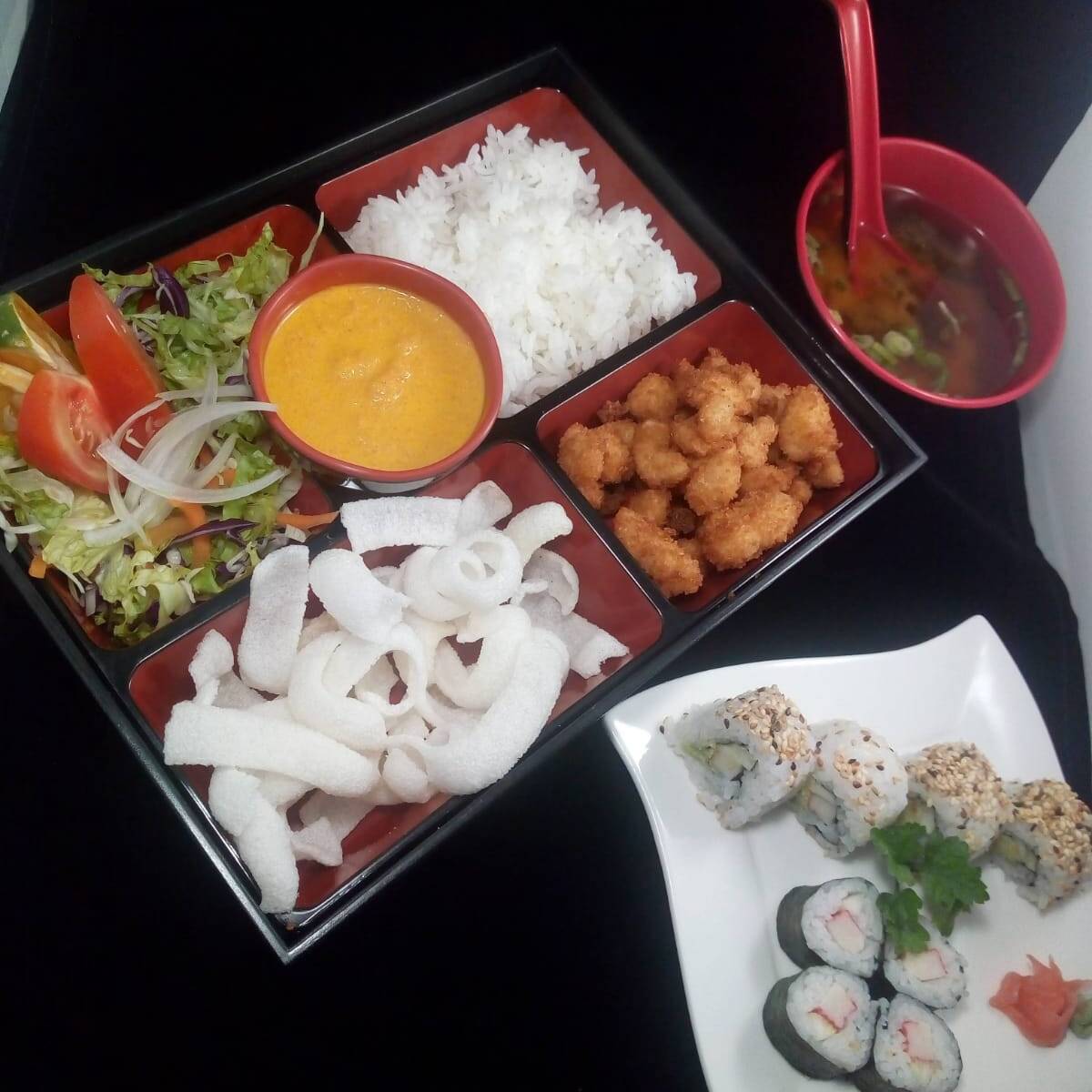 ToriKatsu, Gojan, Miso ensalada, maroni, 4 california, 4 makis