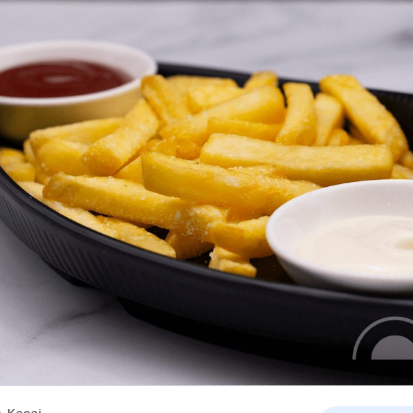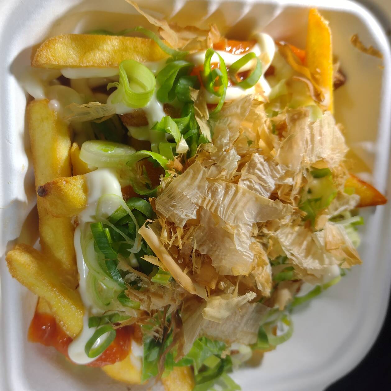 Papas, salsa katsu, mayonesa, cebollino y hojuelas de bonito.