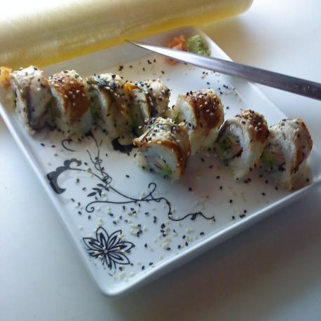 Anguila, pepino, queso crema, surimi, aguacate, ajonjolí, salsa de anguila.