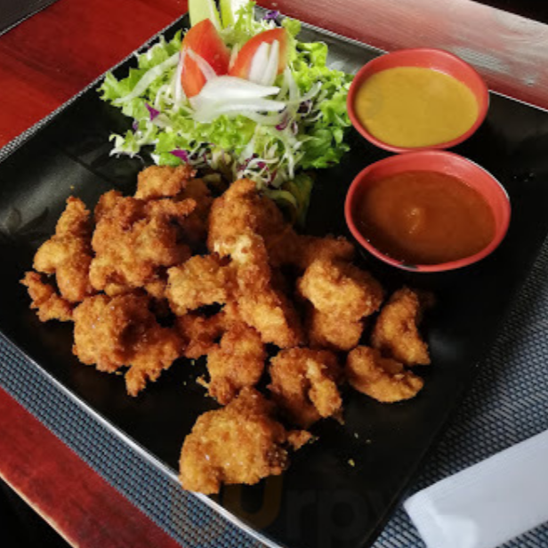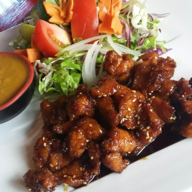 Trocitos de pollo, jengibre, tobanya, soya, shirasha, cebolla acompañado de arroz y ensalada