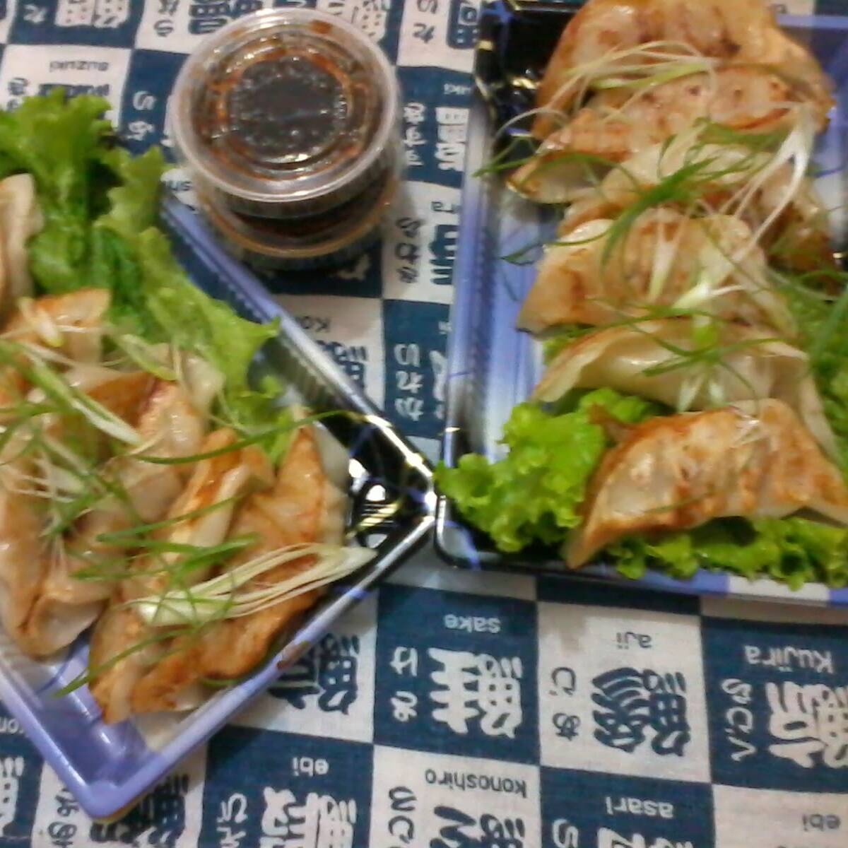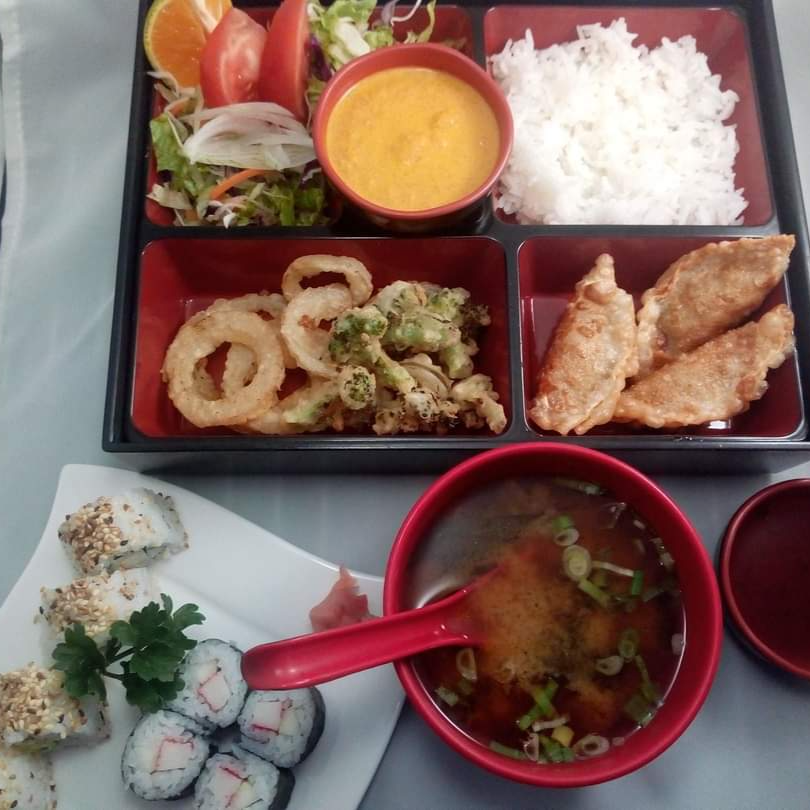 3 gyozas, tempura de brocoli y cebolla, ensalada, gojan, miso, maroni, 4 california, 4 makis