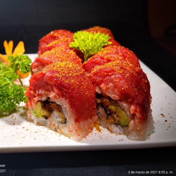 Aguacate, atún , marlin, surime, arroz tostado, chile chipotle, nanami, salsa de soya