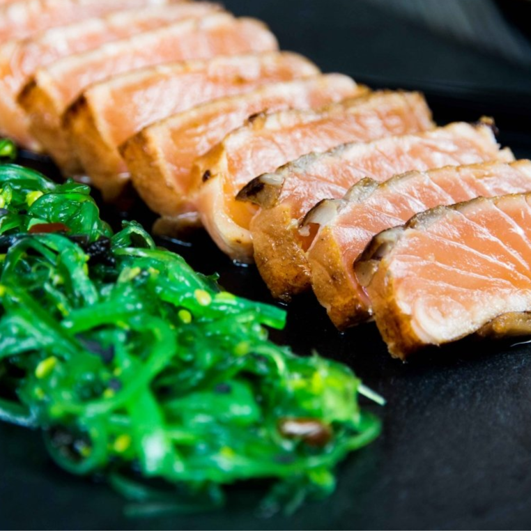 Lonjas de pescado ligeramente flambeado , masago, hiriashiwakame en salsa ponsu, cebollino y ajonjolí.