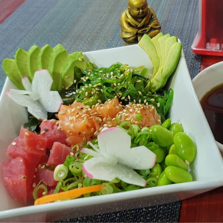 Hiriashiwakame,atun,masago, salmón, kani, edamames, lechuga, pepino, repollo, aguacate ,wakame y ajonjoli