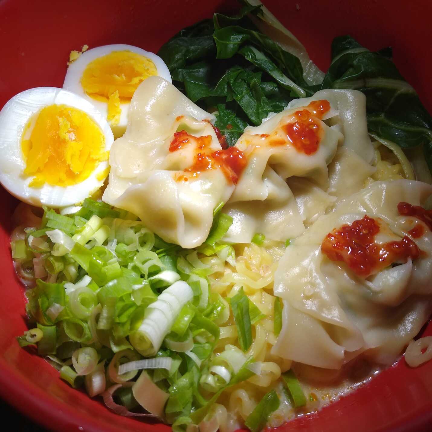 Huevo, cebollín, wakame, gyozas de camarón, tobanya, caldo de camarón, leche, acelga y kani.