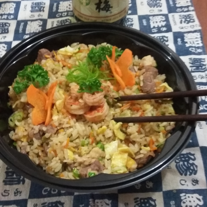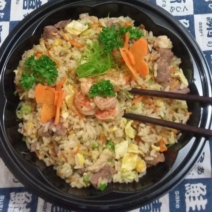 Arroz, trocitos de pollo, cebolla, chile dulce, ajonjolí y salsa teriyaki.