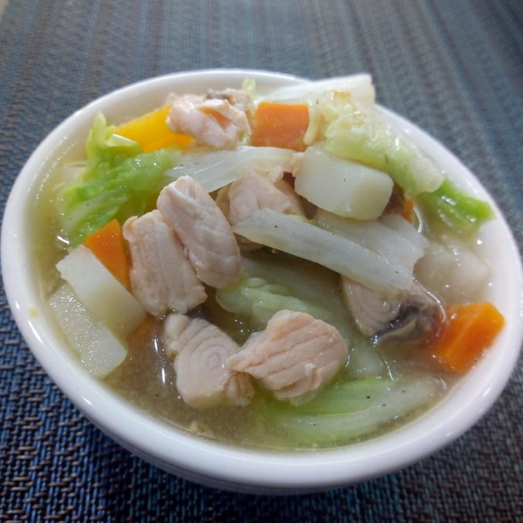 Fideos, salmón, miso chitake, zanahoria, papa, mostaza china y cebollin.