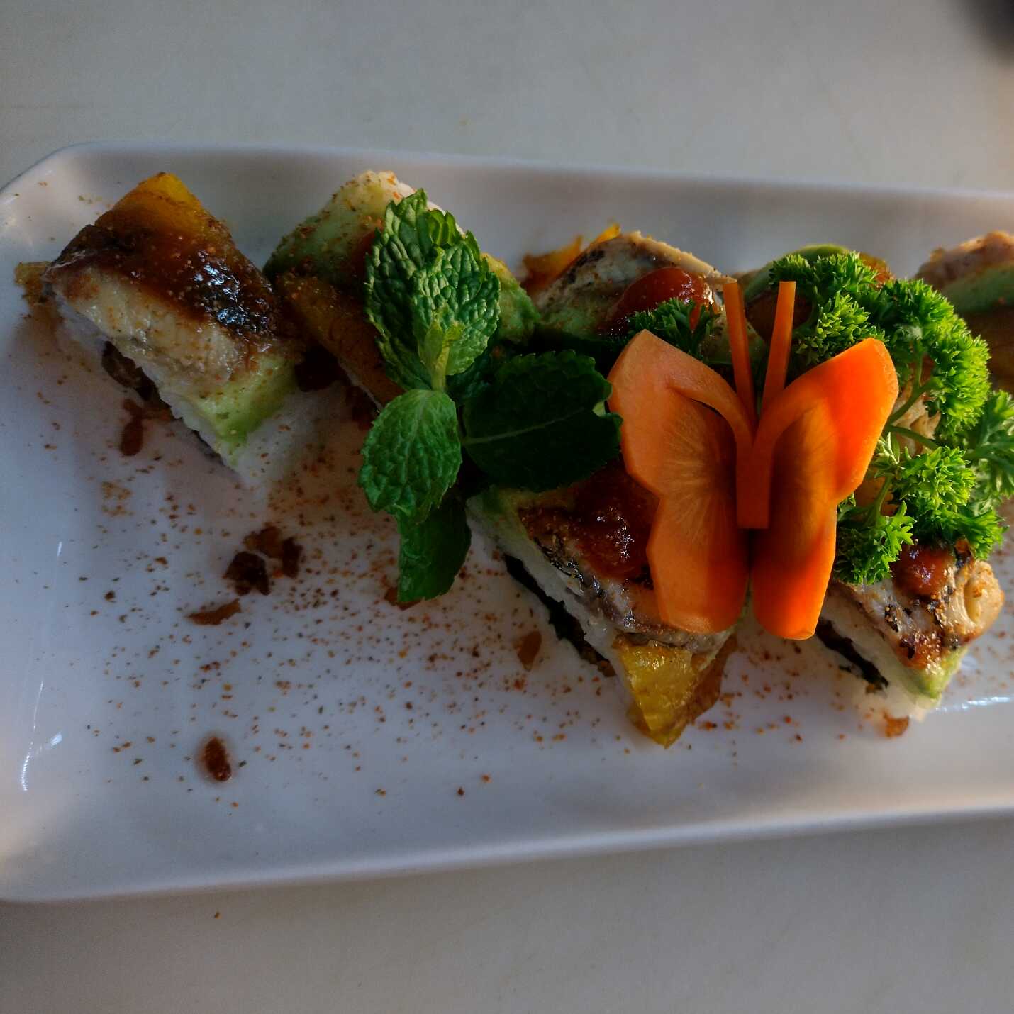 Aguacate, ajonjolí, queso crema, camarón tempura, salsa de anguila.