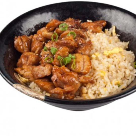 Arroz, trocitos de pollo, cebolla, cebollino, salsa donburi y huevo semi cocinado.