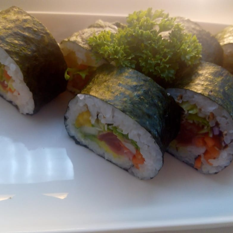 Zanahoria, repollo, tomate, maduro, ajonjoli, aguacate, pepino, gari, chitake, salsa de soya
