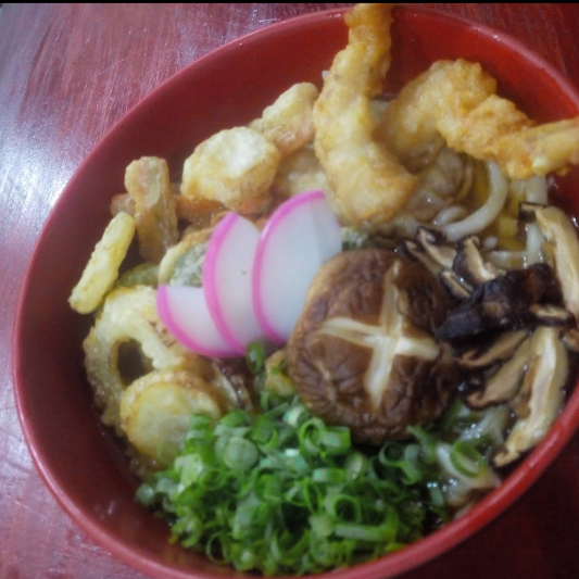 Fideos udon, tempura de cebolla, brócoli, y zanahoria, camarón, cebollino, chitake y kamaboko.