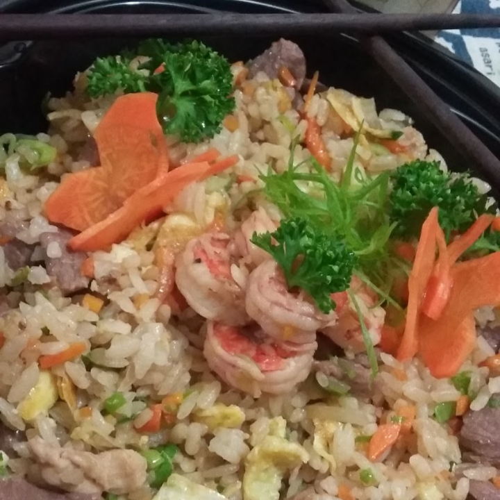 Arroz, camarón, ajo, pollo, jengibre, lomito, huevo, cebolla, cebollino acompañado de ensalada