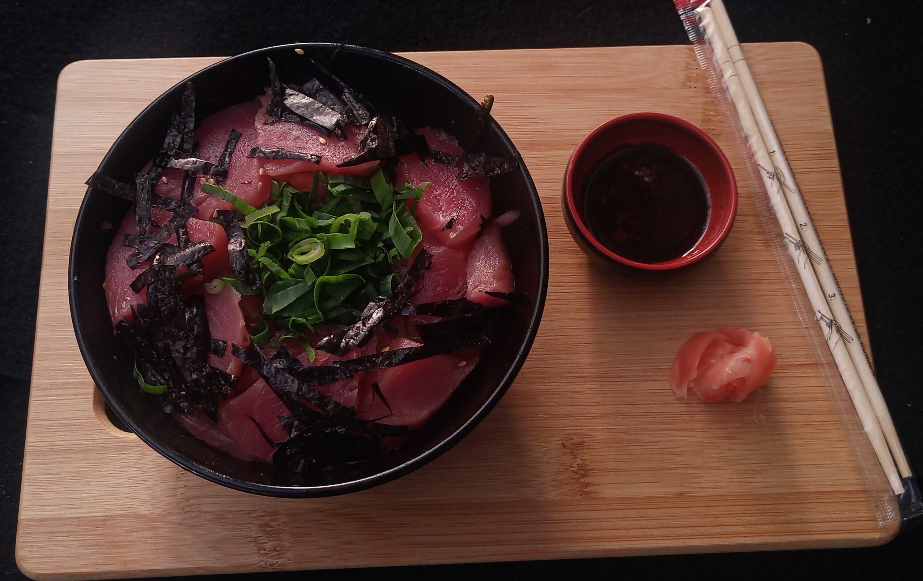 7 Piezas de atún. Incluye wasabi, jengibre, salsa soya, salsa anguila y palillos.