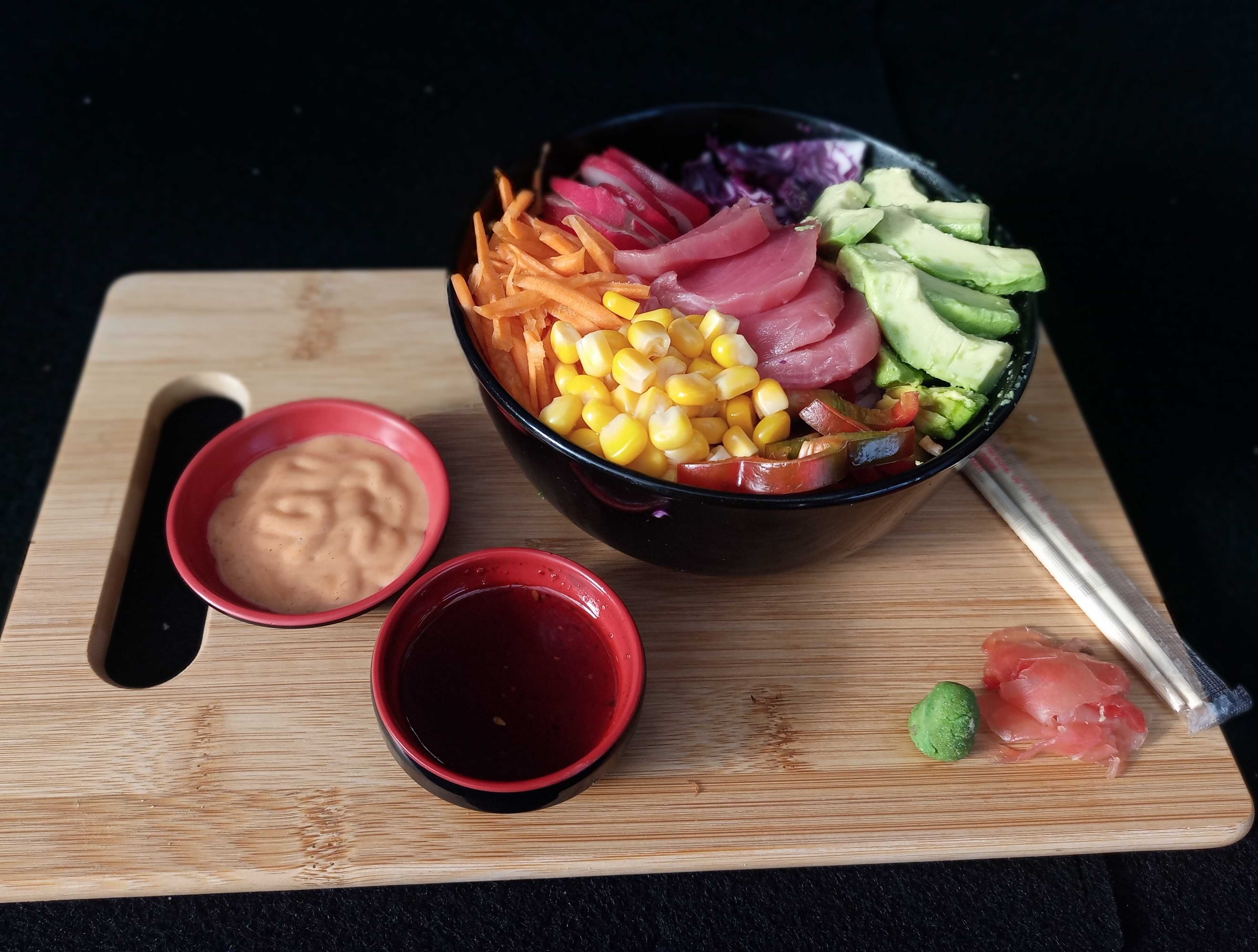 Arroz de sushi, chile dulce, aguacate, zanahoria, maiz dulce, pepino, repollo morado y rábano + 1 proteína + salsas mayo spicy y clásica.