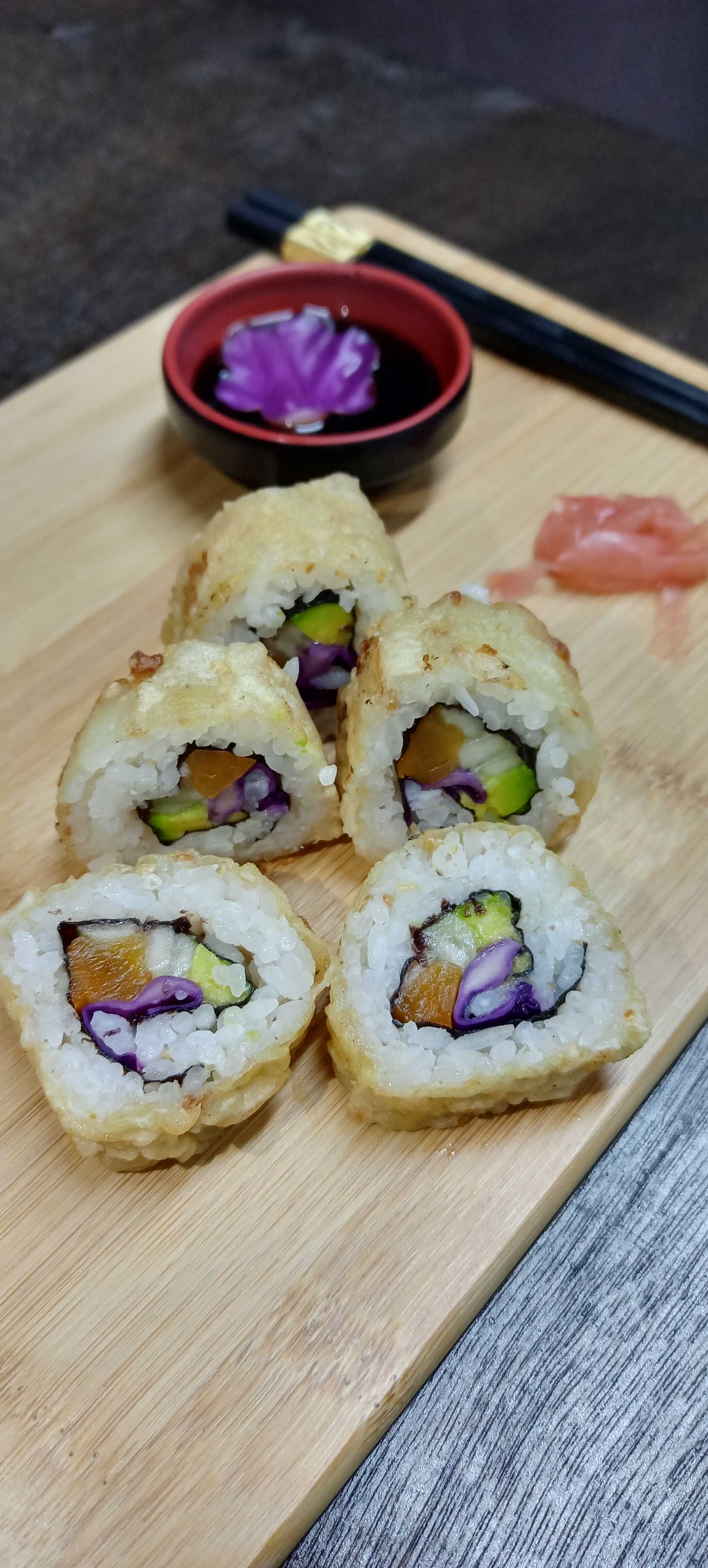 Repollo morado, aguacate, pepino y zanahoria. Cobertura tempurizada.