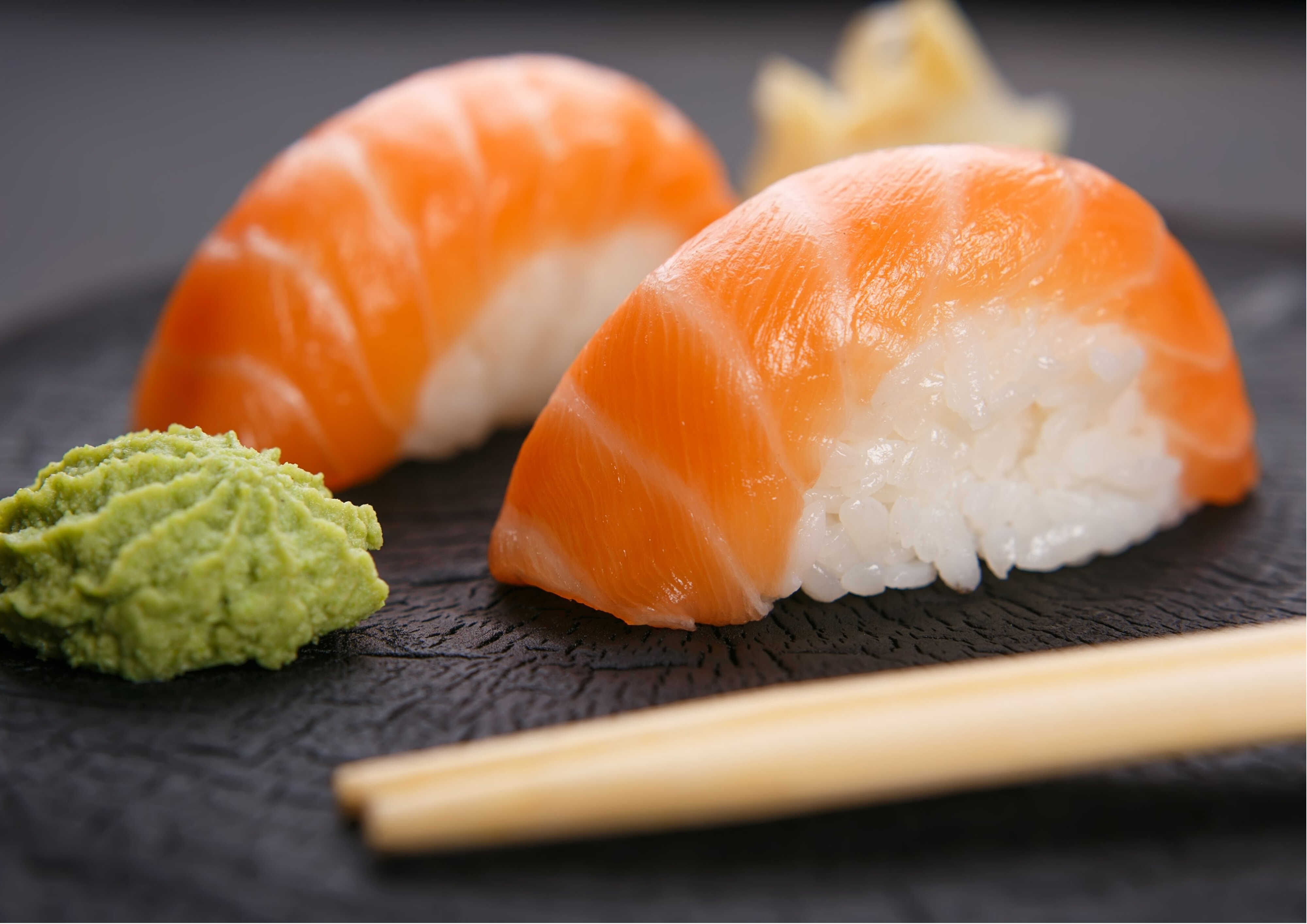 2 Piezas de arroz con cobertura de salmón.