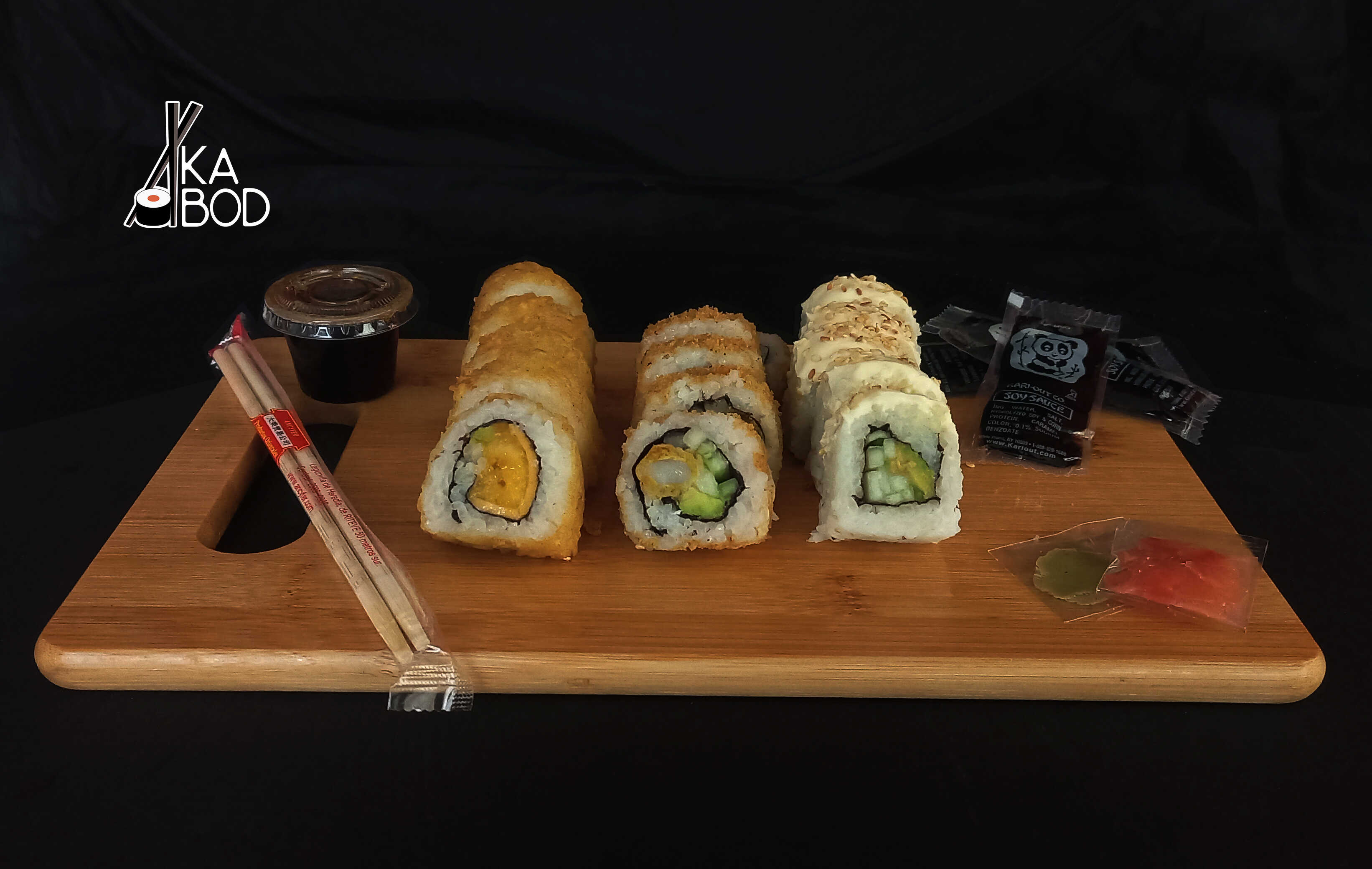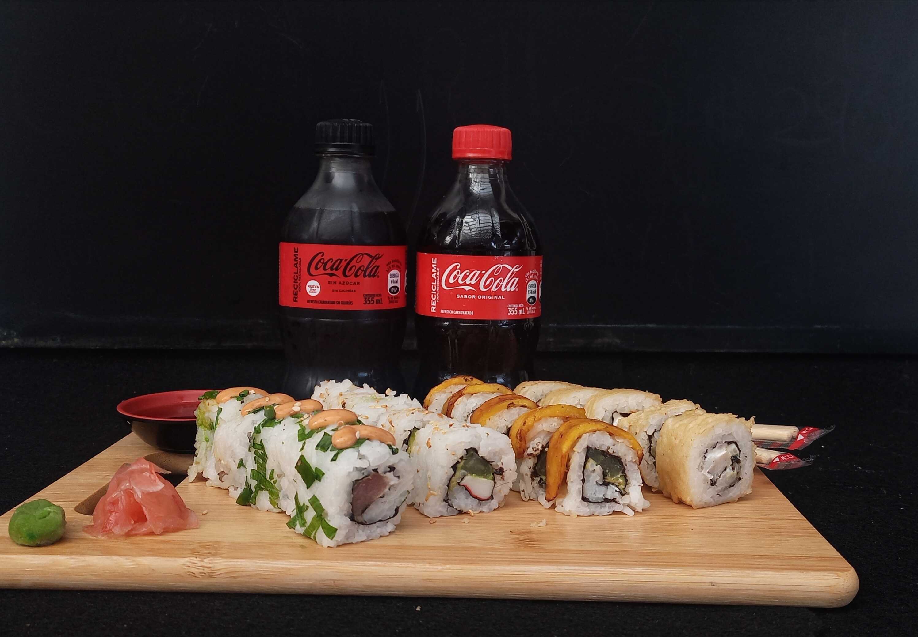 10 piezas. Ingredientes: Pepino, aguacate y kanikama, con cobertura de ajonjolí.Base california, con cobertura de variedad de pescados y aguacate.