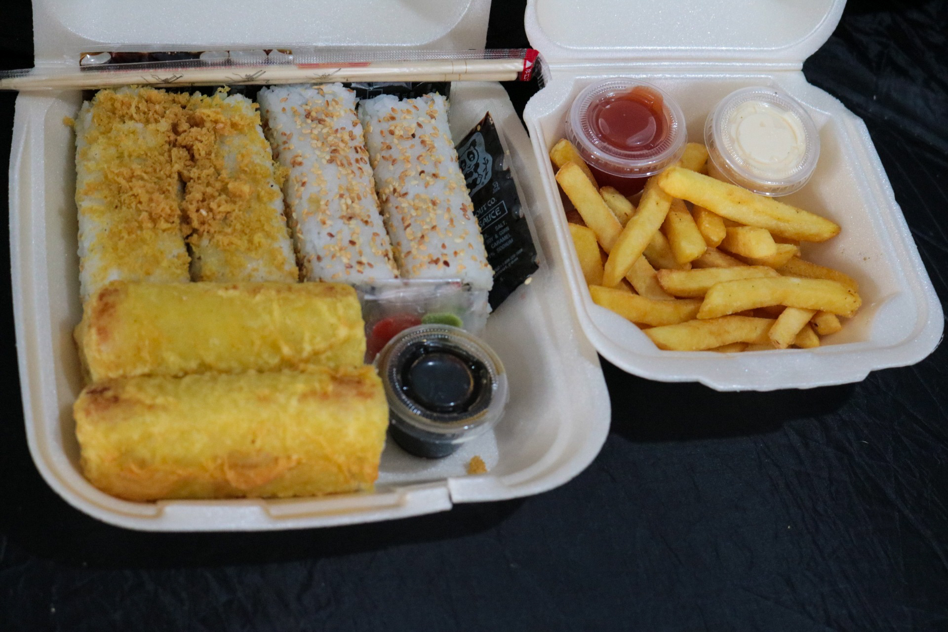 son 3 delicosos rollos acompañados de papas fritas y salsas.