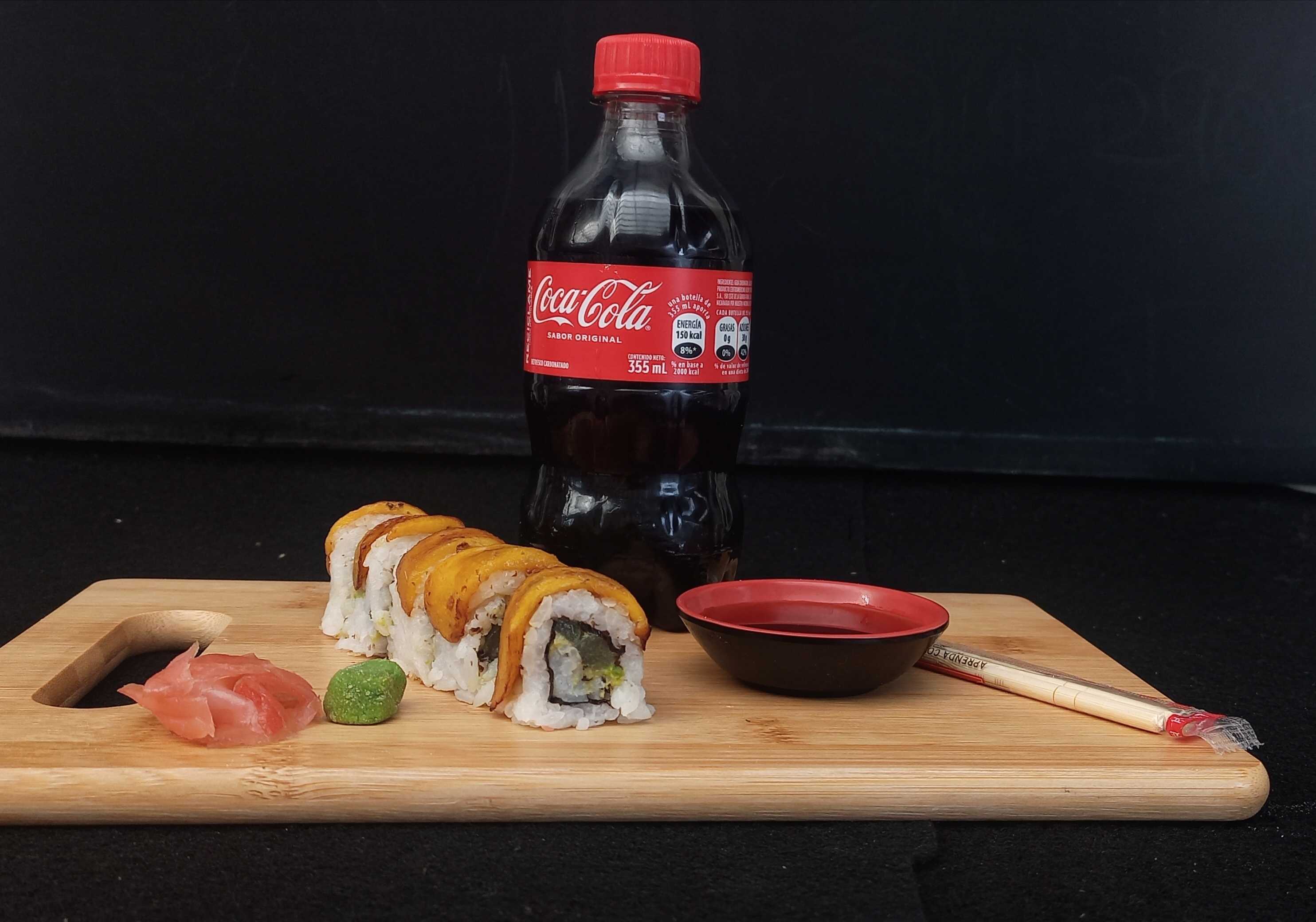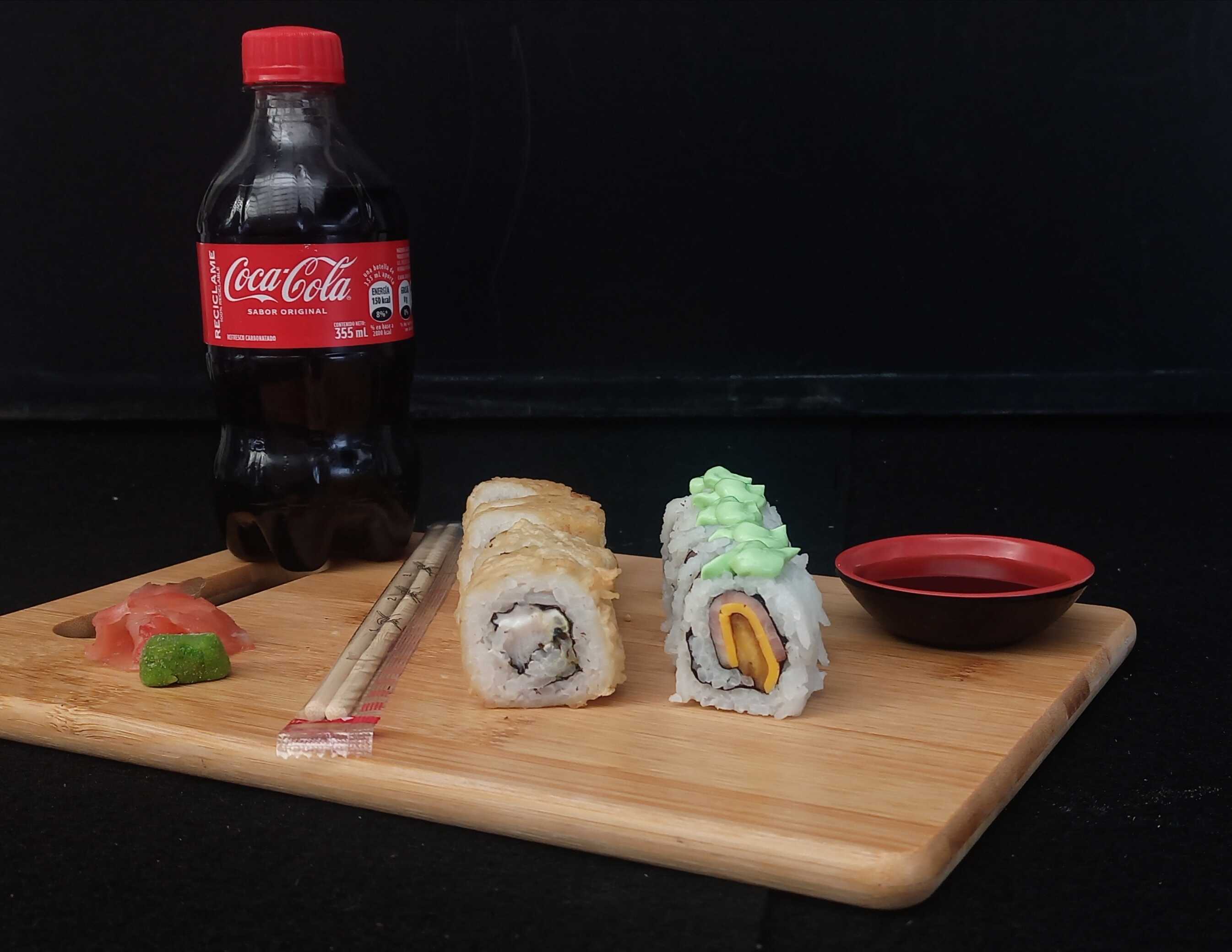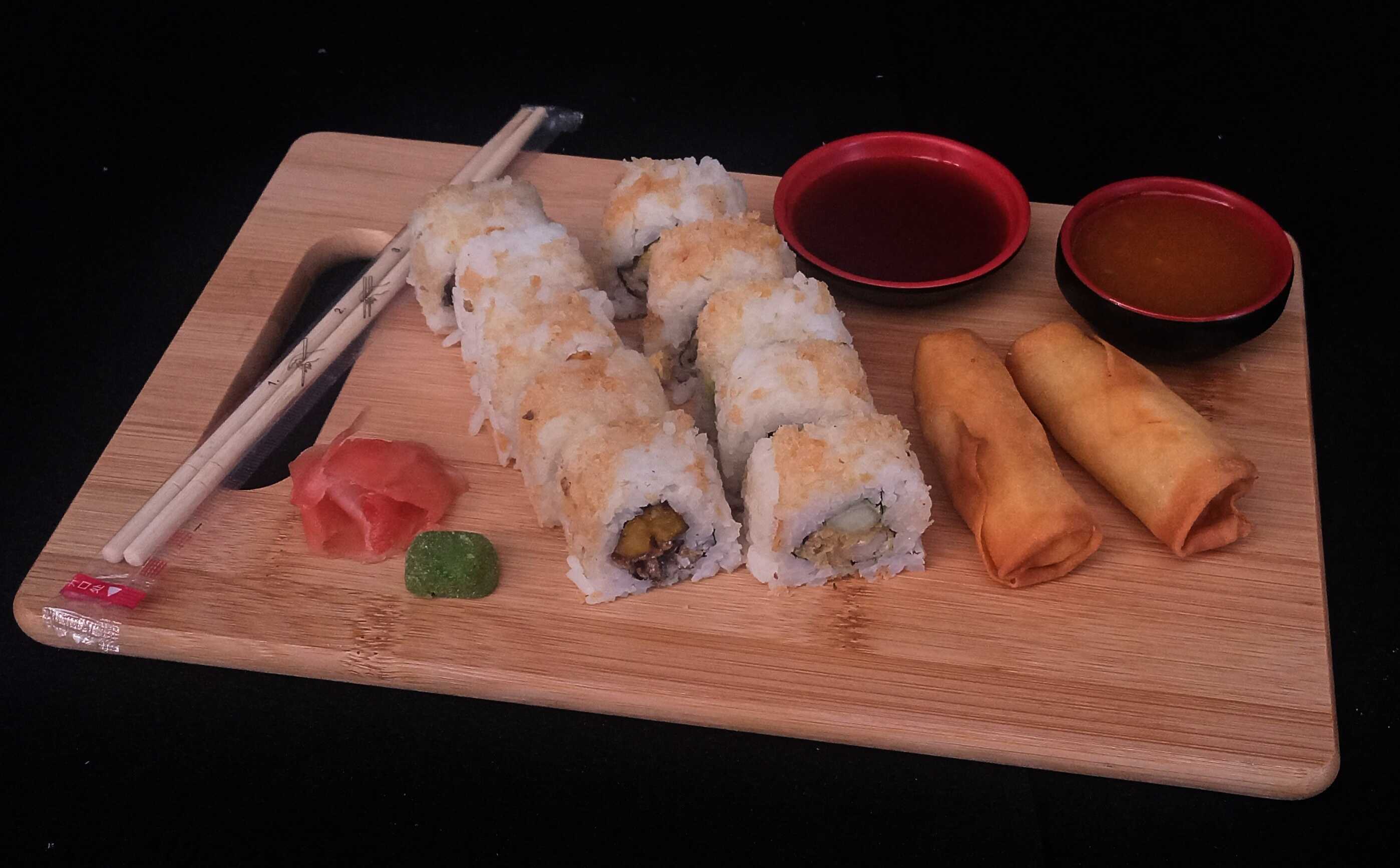 10 piezas. Ingredientes: Pepino, aguacate y kanikama, con cobertura de ajonjolí.Pollo tempura, aguacate y queso crema, con cobertura crispy.