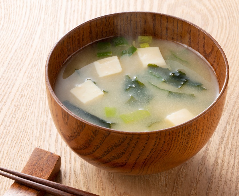 Sopa a base de soya con algas, cebollín y tofu.