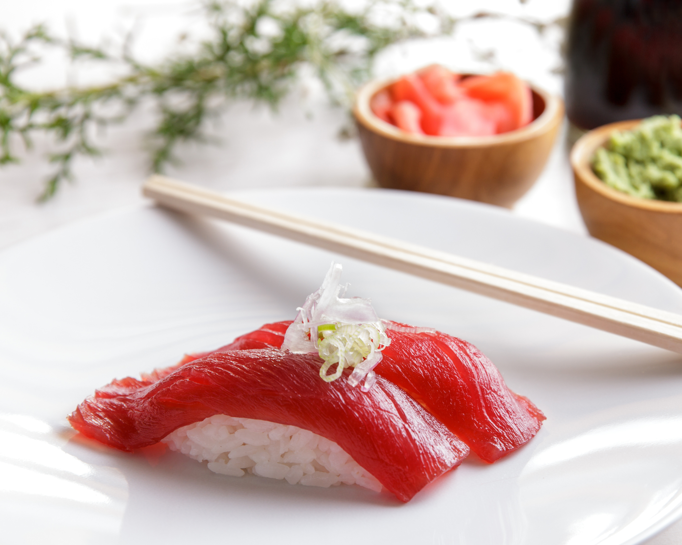 Arroz de sushi, nori, cebollín y atún + salsa wasabi.