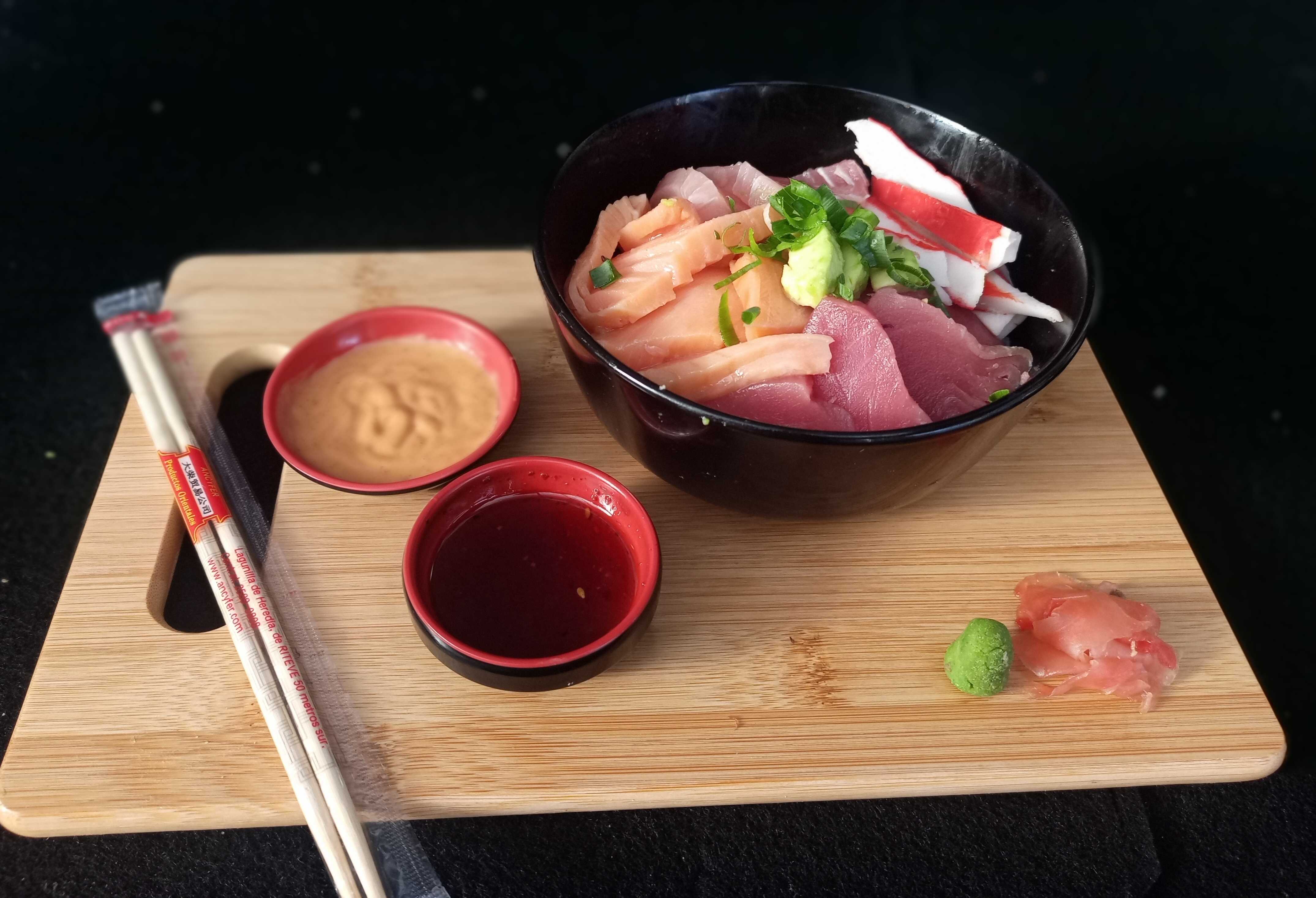 Variedad de pescados y kanikama sobre arroz de sushi + salsa spicy mayo.