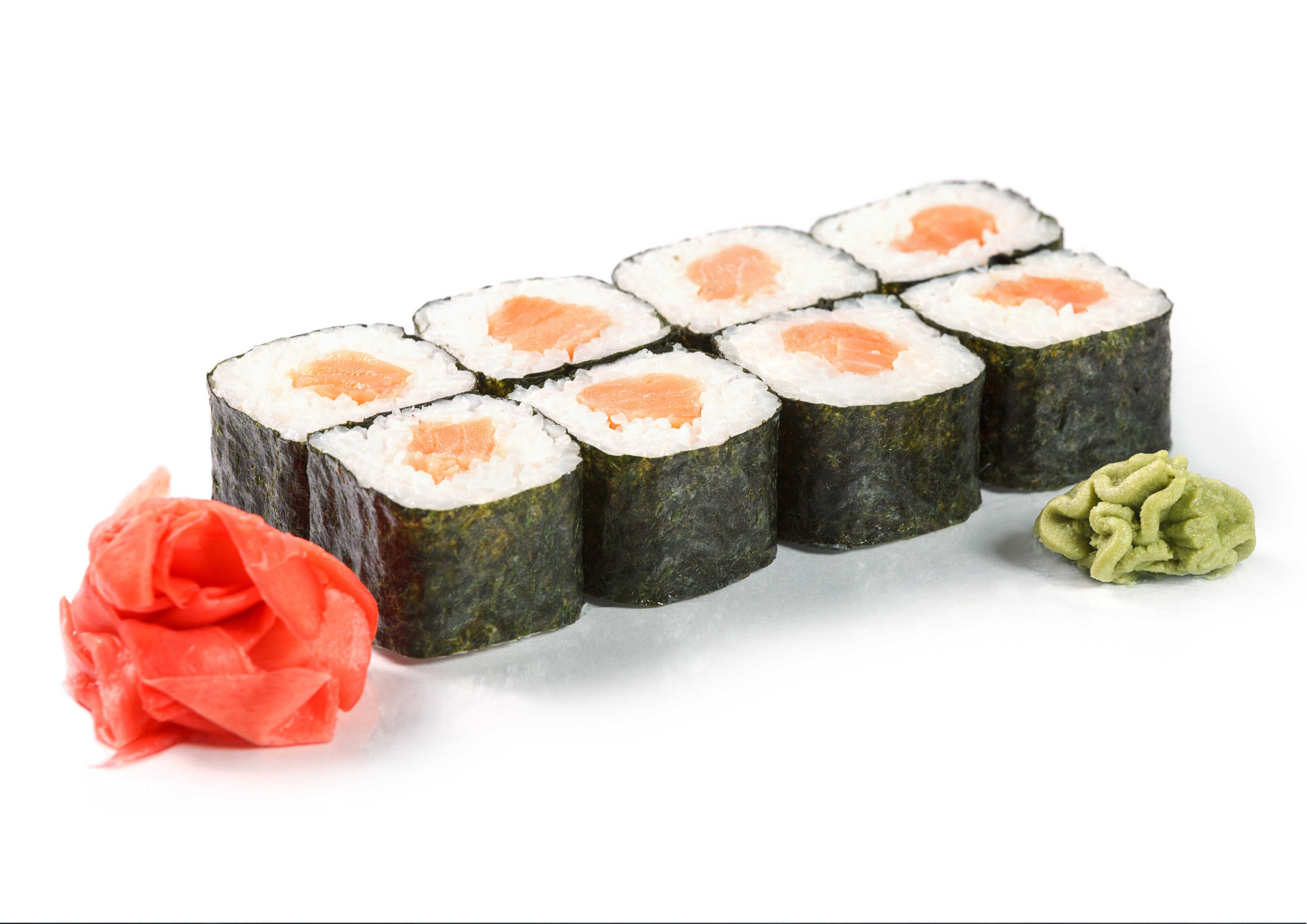 7 Piezas de salmón. Incluye wasabi, jengibre, salsa soya, salsa anguila y palillos.