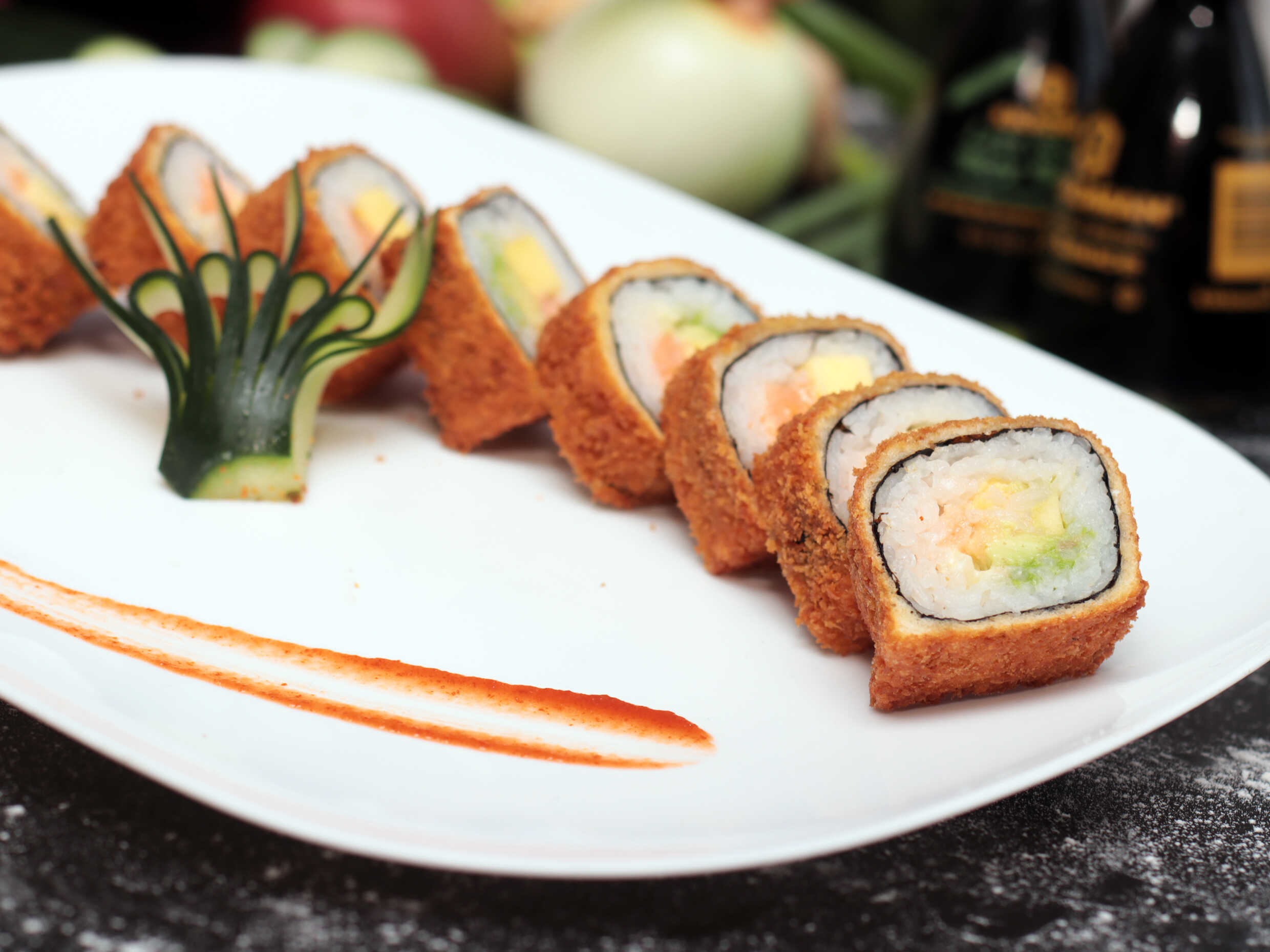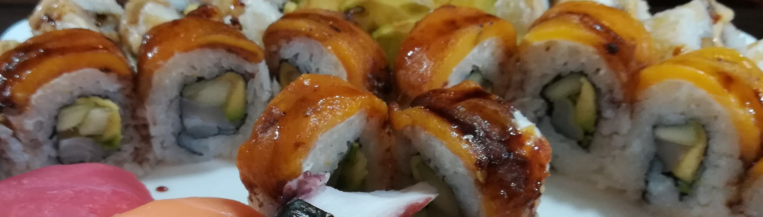 Pescado blanco pankonizado, pepino y queso crema con cobertura de plátano maduro y salsa unagi.