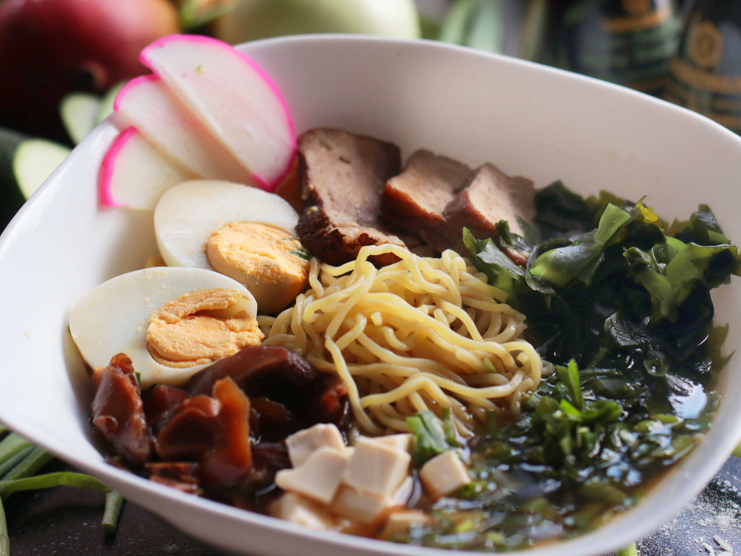 Ramen original, alga wakame, cebollino, hongo shitake, queso tofu, kamaboku y huevo.