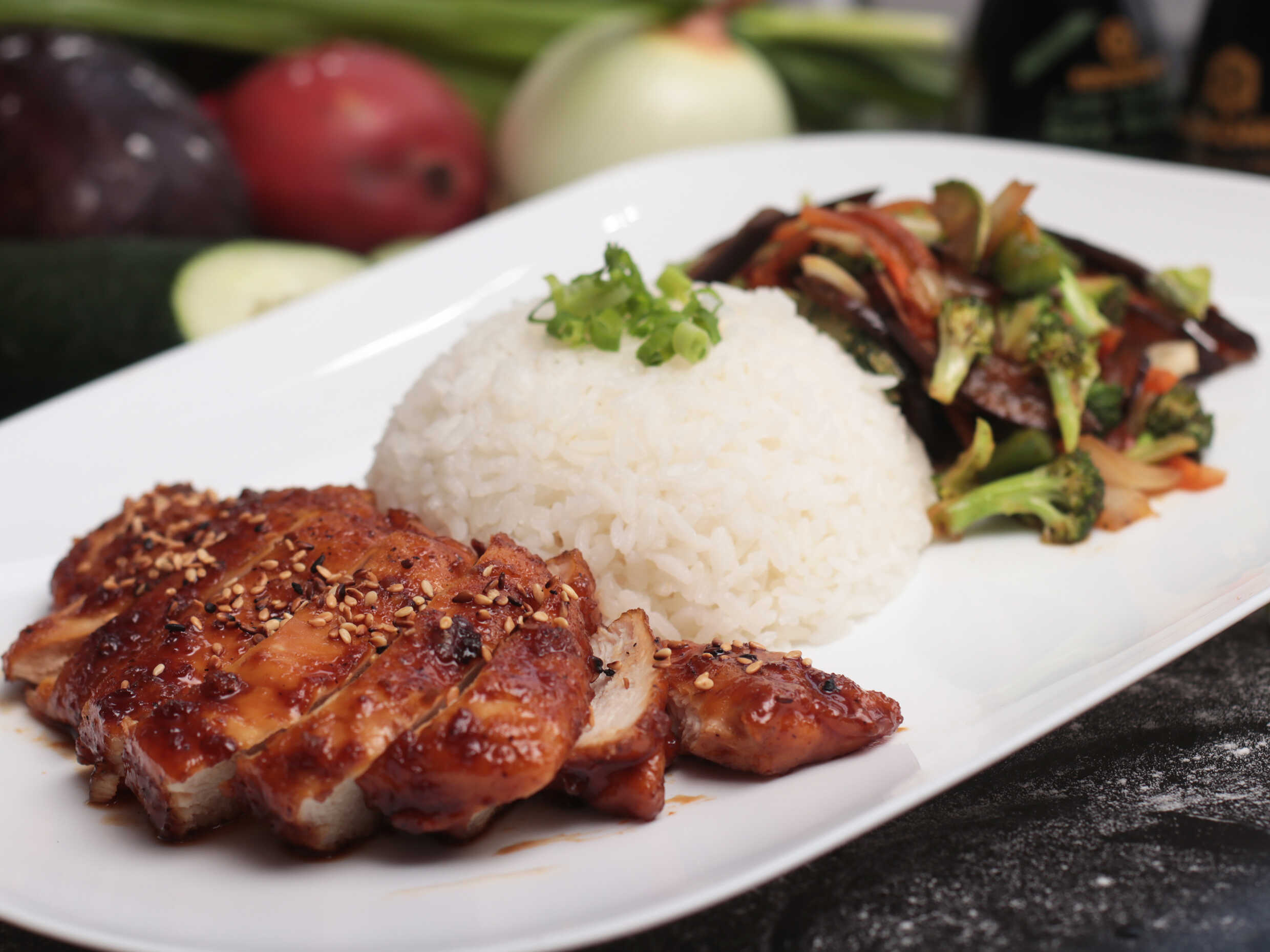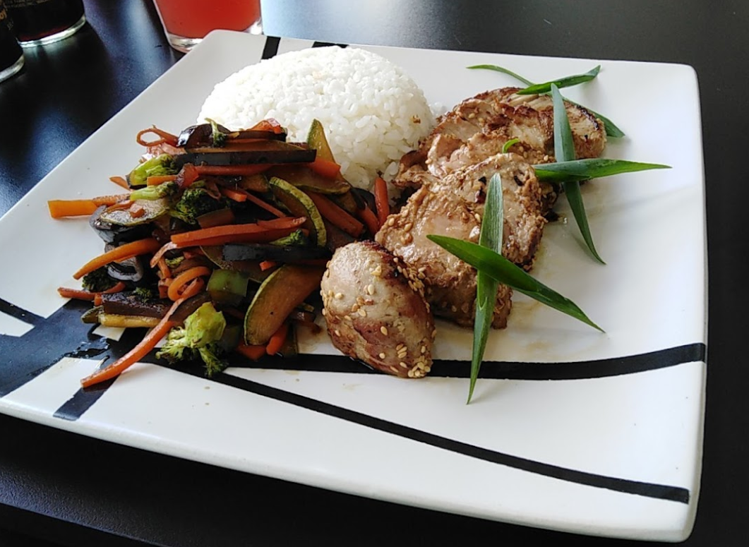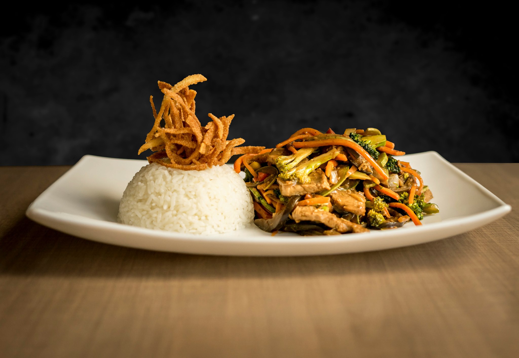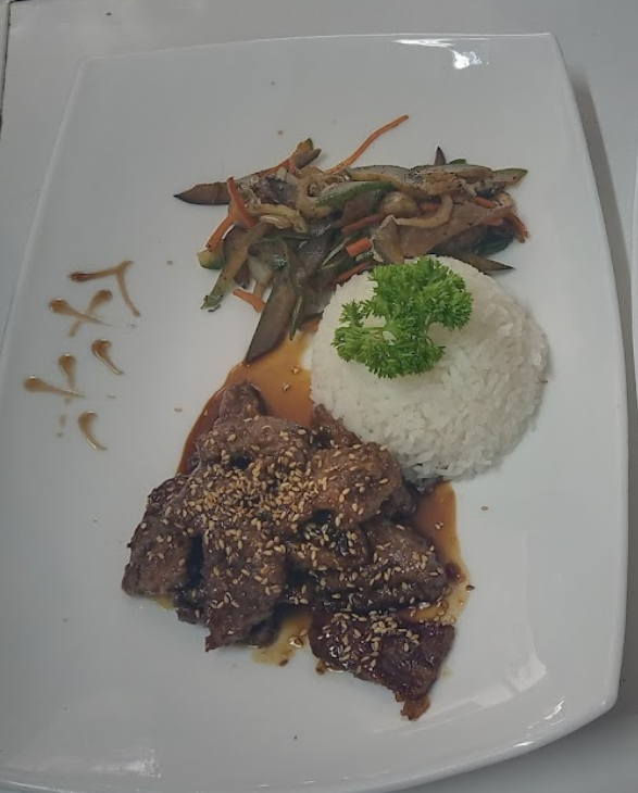 Lomo flambeado con vegetales en salsa tepanyaki, acompañado de arroz gohan.