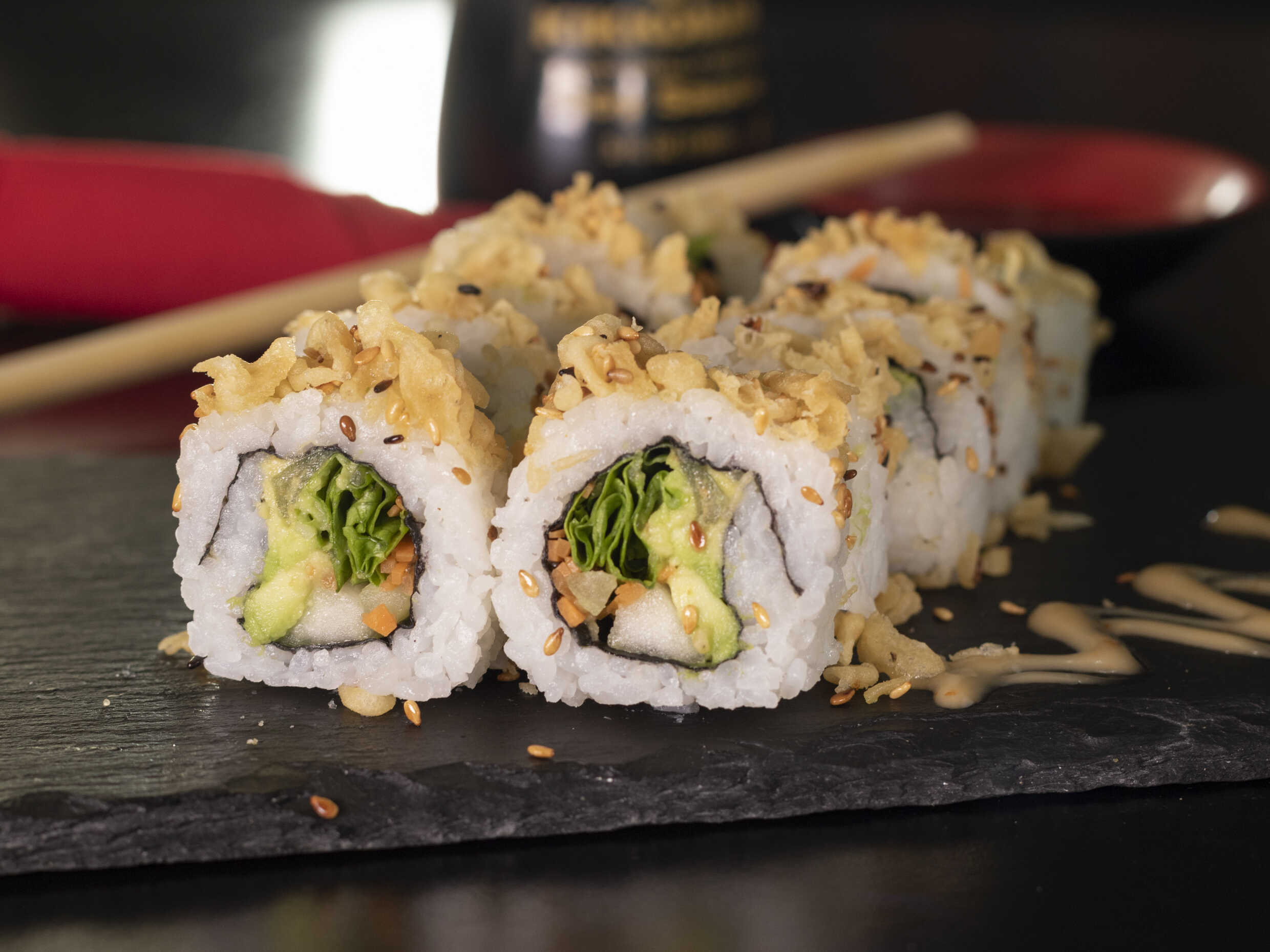 Aguacate, pepino, lechuga, zanahoria con cobertura de ajonjolí y hojuelas tempura.