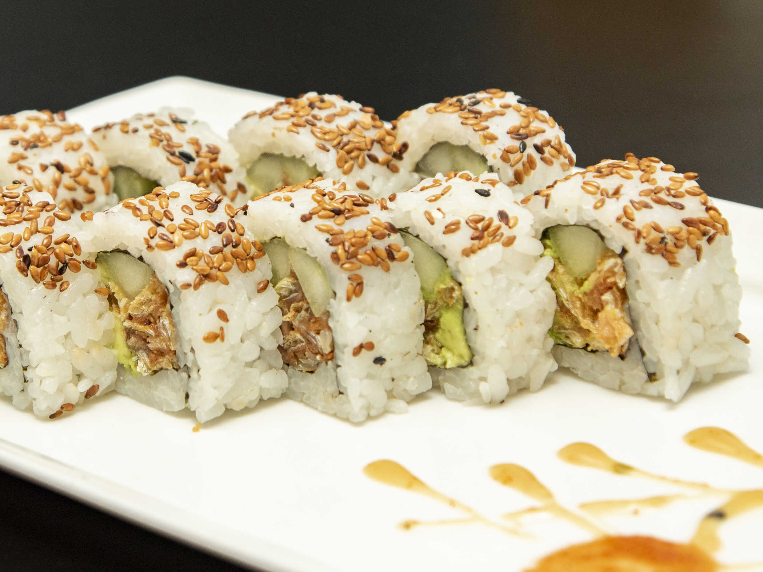 Salmón, aguacate, pepino y queso crema con cobertura de semillas de ajonjolí.