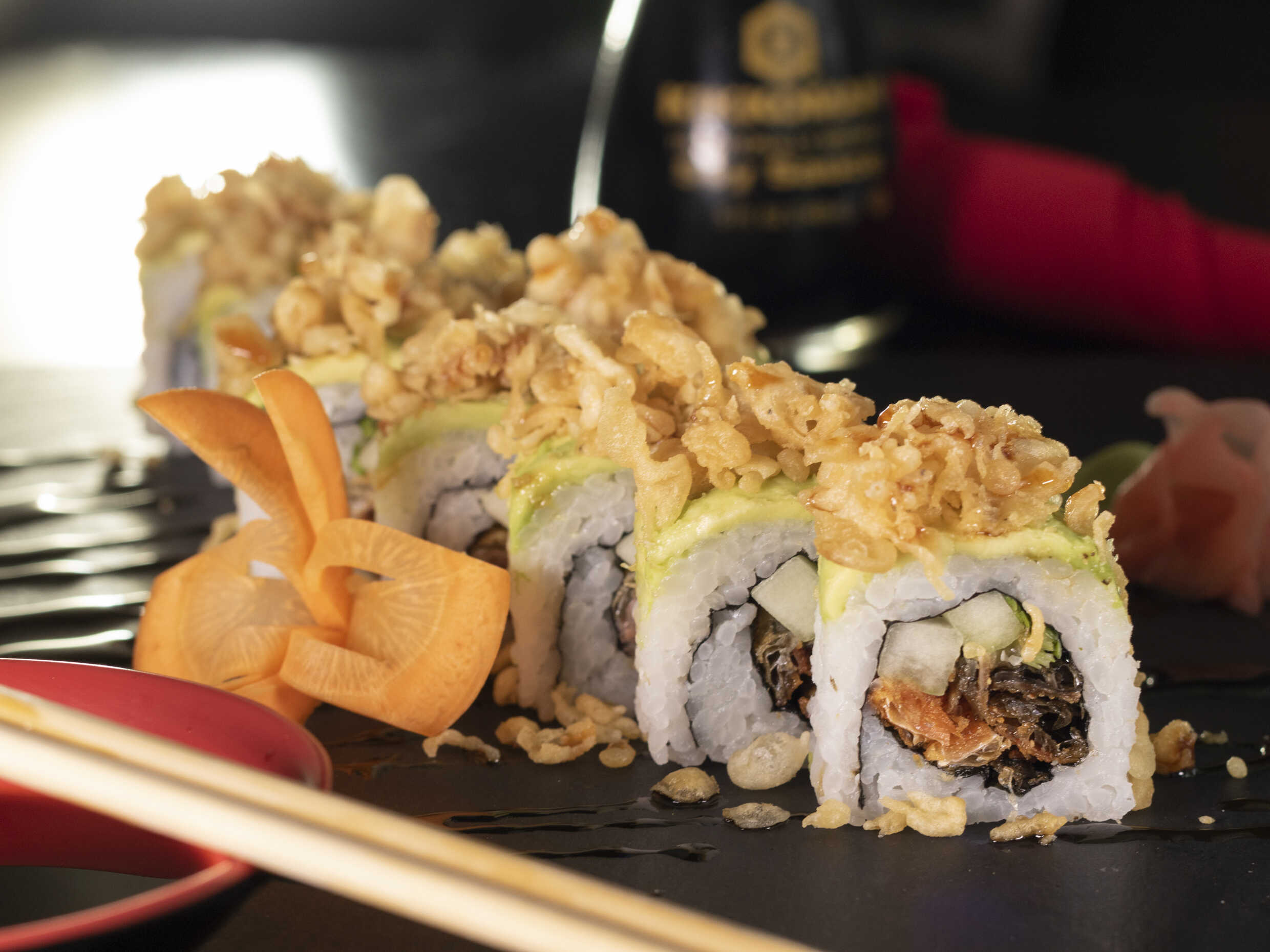 Cangrejo de corteza suave, queso crema, sriracha, aguacate y cebollino, cobertura caliente pankonizada con salsa de anguila y salsa golden.