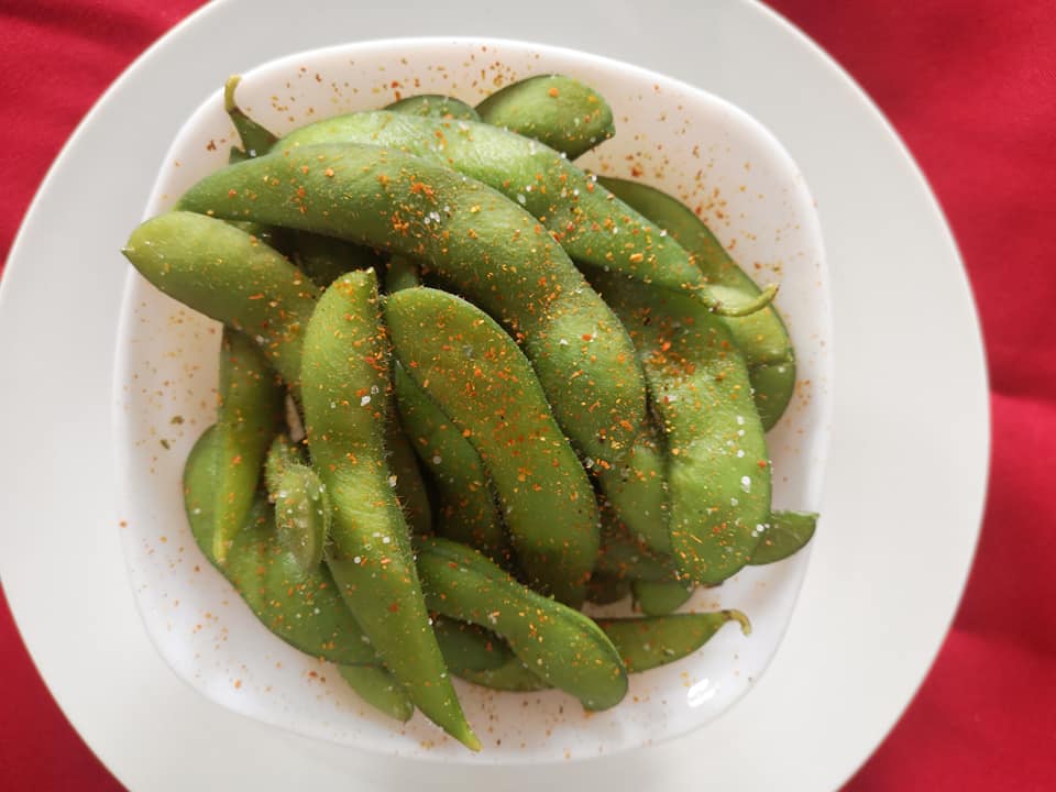 Frijol soya, shitake (hongo japonés), aguacate yasaitame (vegetales al wok), y wakame (alga de río).