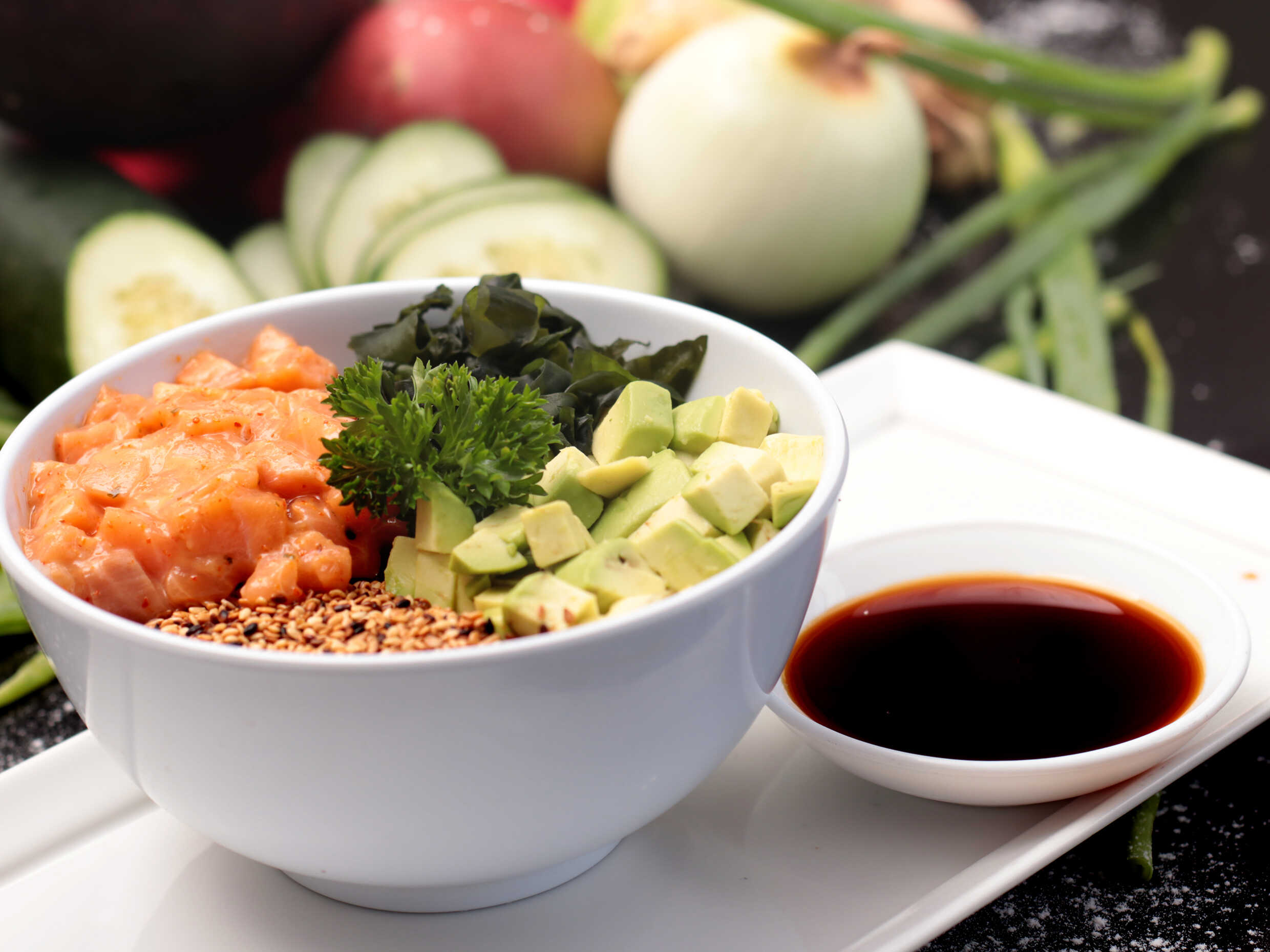 Salmón fresco aderezdo (tartar, aguacate, wakame (alga de río) y semillas de ajonjoli mixtas.