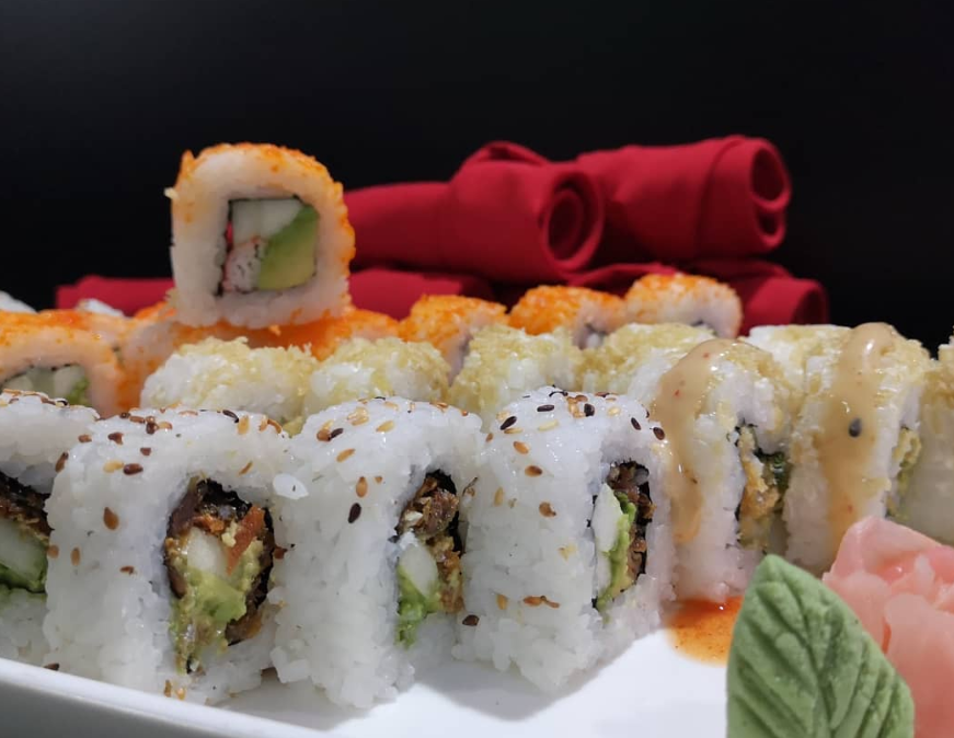 Atún, camarón, pepino, salsa golden, pimienta japonesa y cobertura con salsa de anguila.