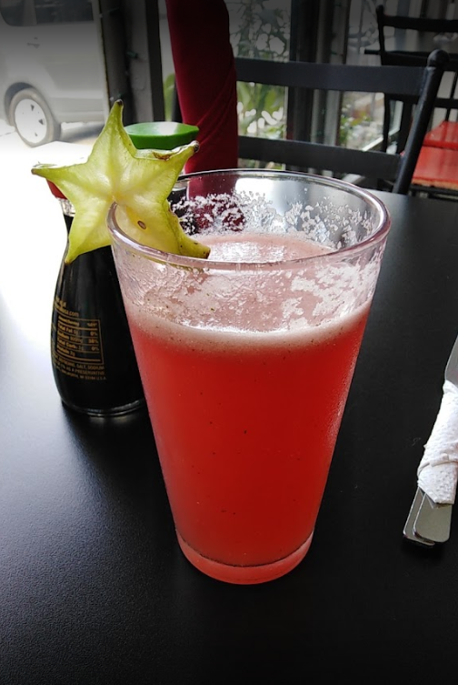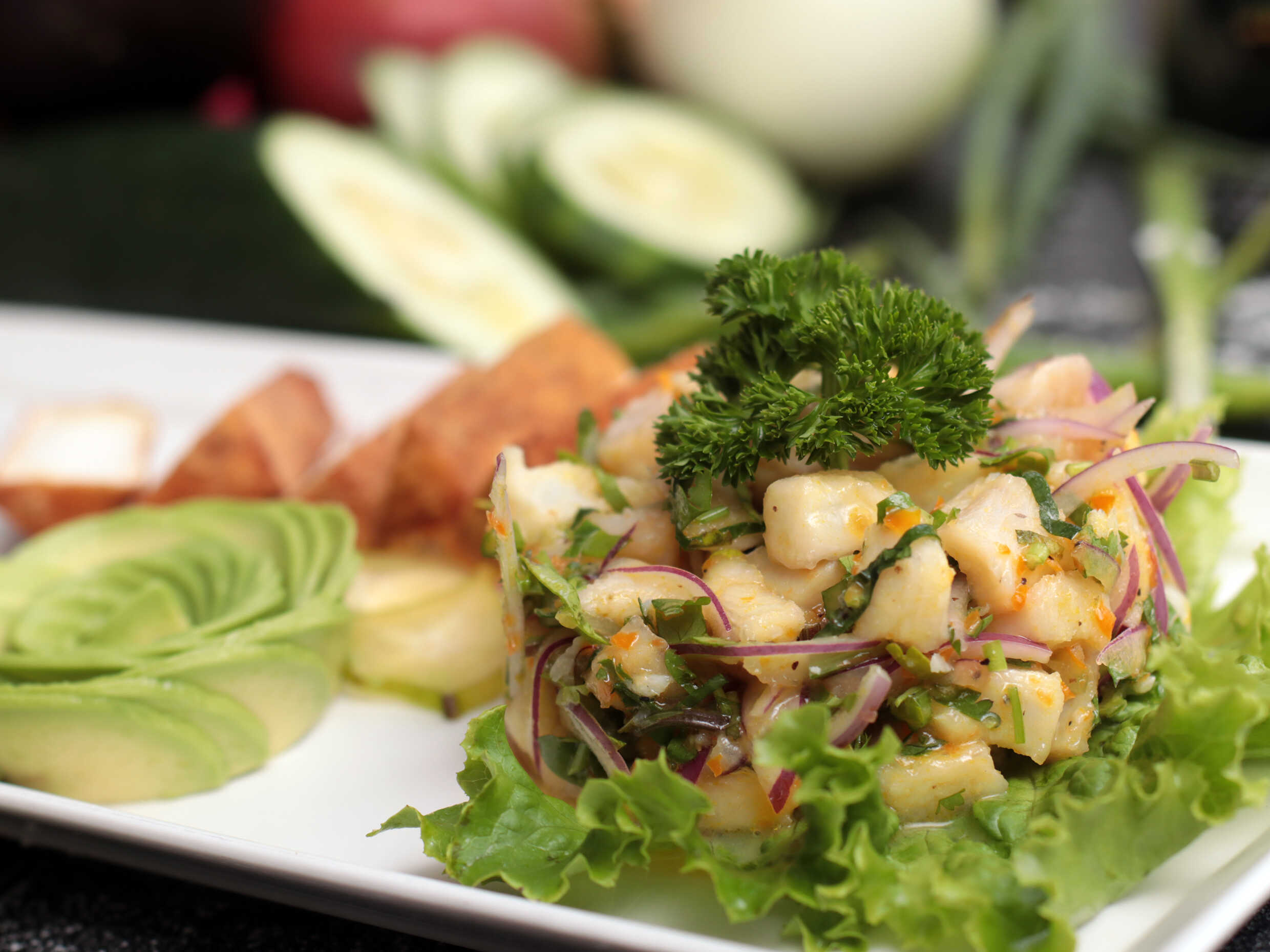 Ceviche peruano/japonés con aguacate, yuca frita y carambola.