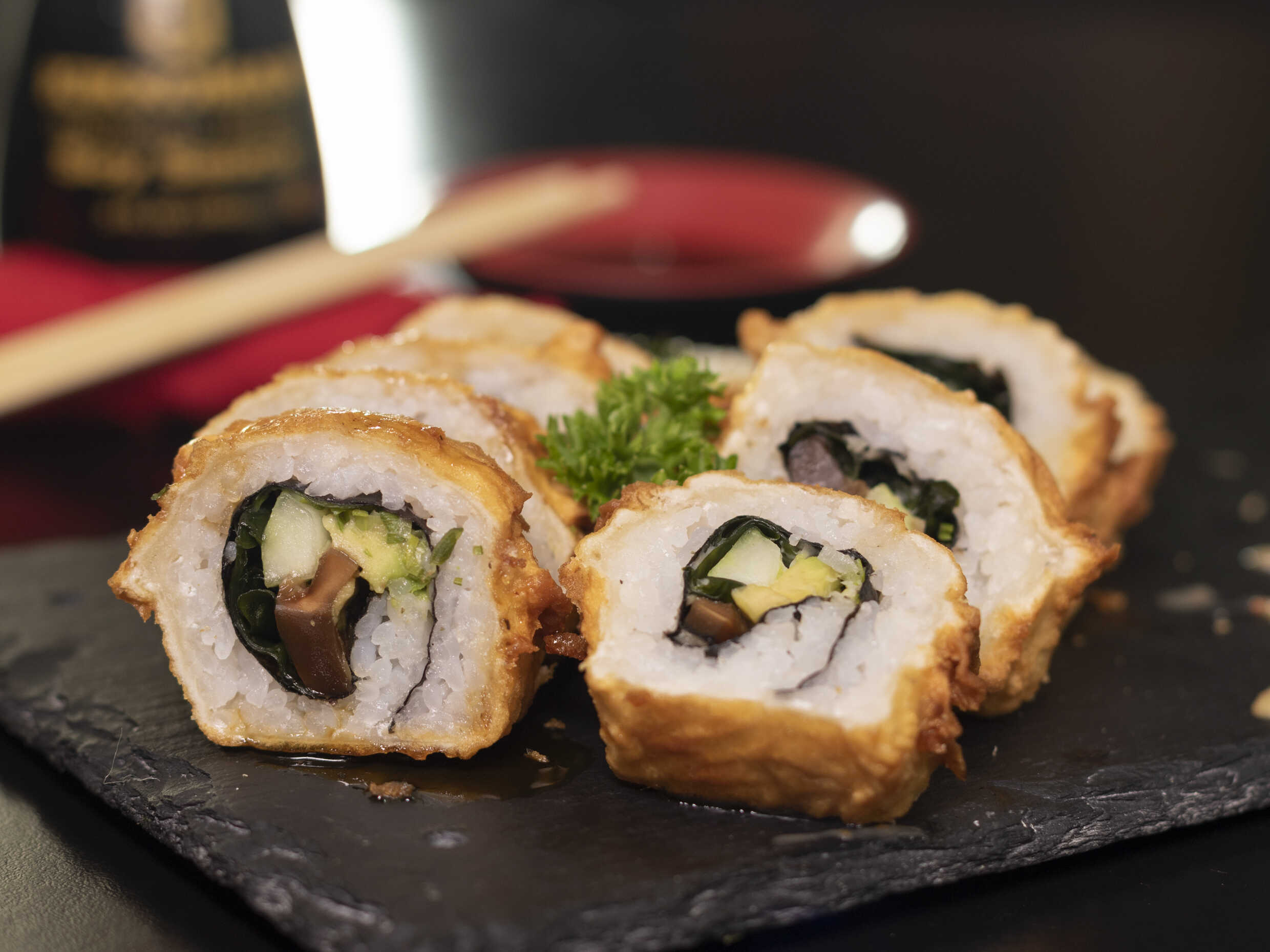 Aguacate, wacame hidratada, cebollino, pepino y shitake; con cobertura tempurizada.