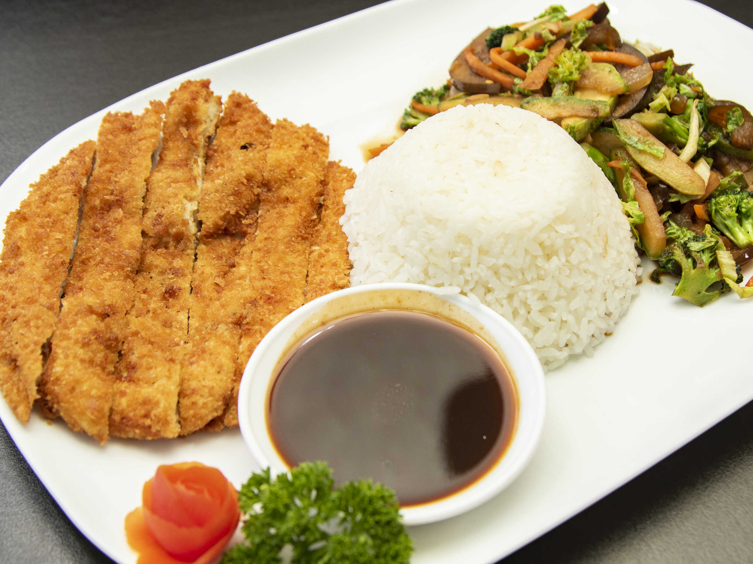 Pollo tempura en salsa thai acompañado de arroz gohan y vegetales yasaitame.