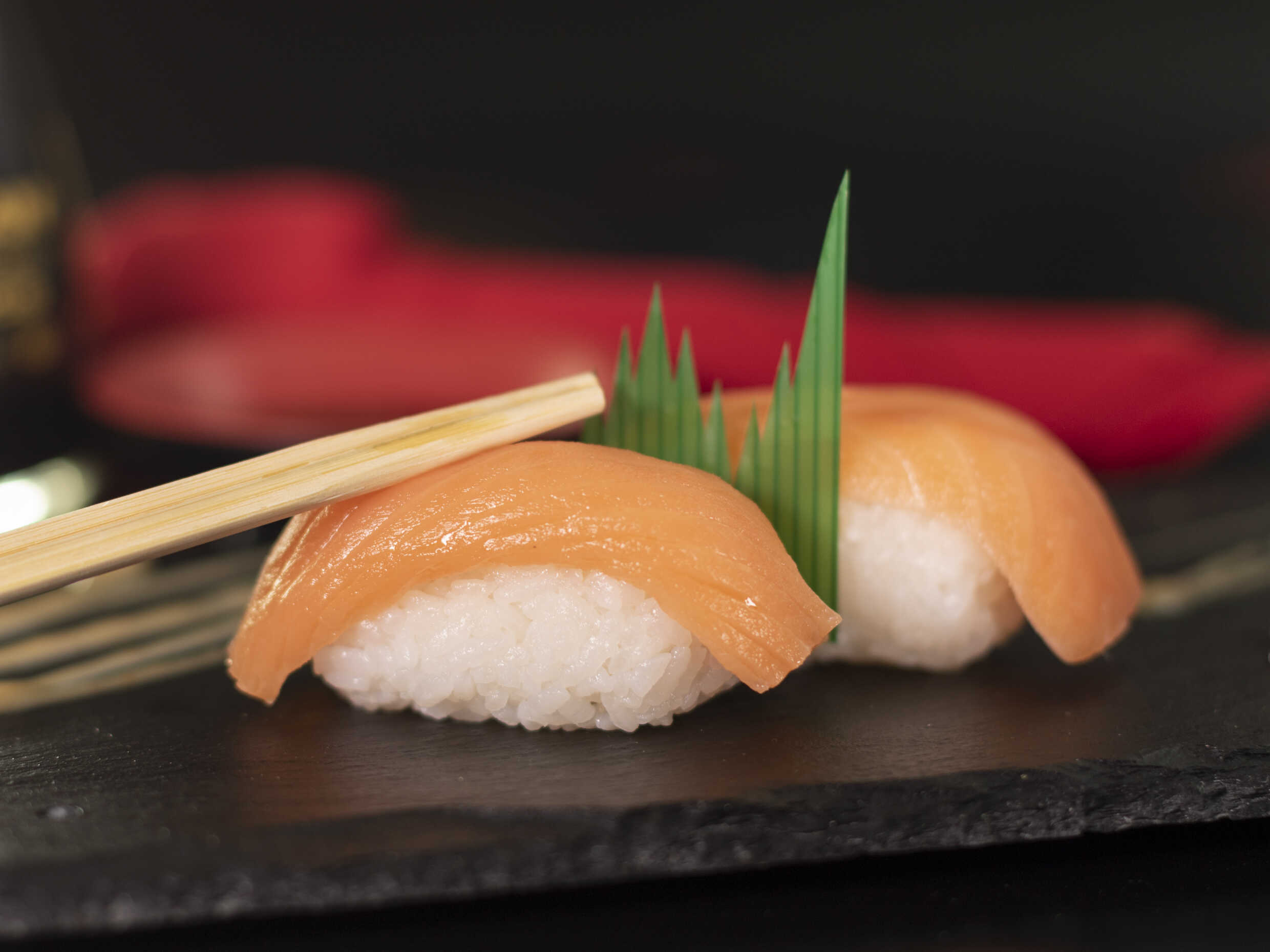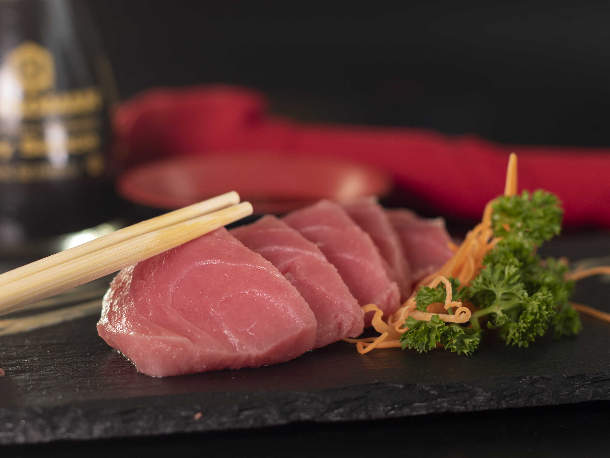 Atún sellado al estilo japonés con semillas de ajonjolí, acompañado con vegetales y nigiris de aguacate.