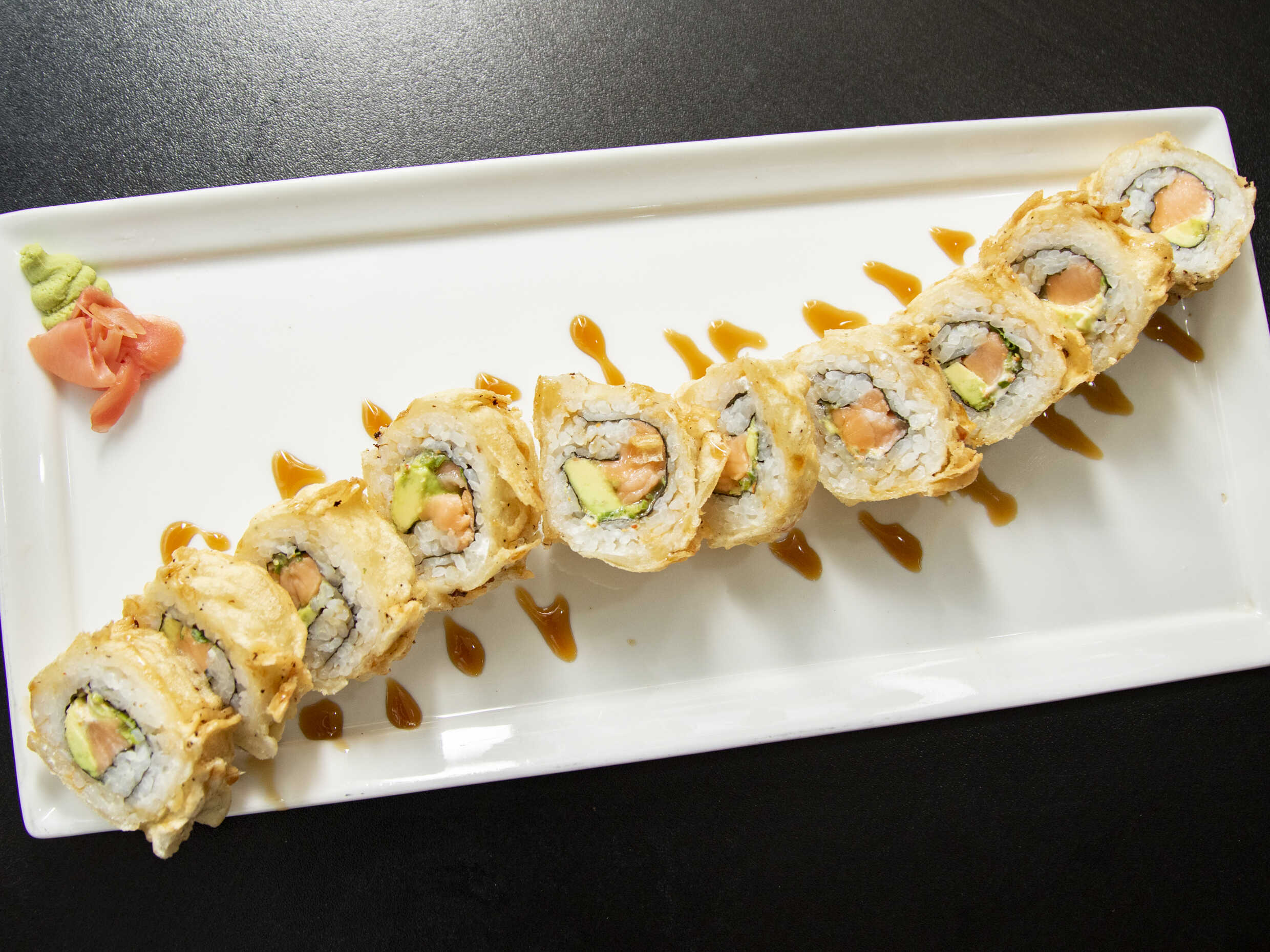 Salmón tempura, pepino y queso crema con cobertura de aguacate, masago y salsa unagi.