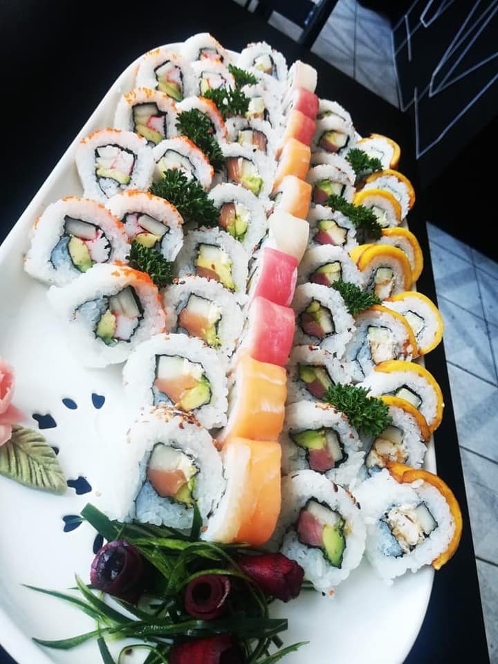 Rollo con 2 sabores, relleno de pescado pank, togarashi, queso crema y pepino, cobertura mitad anguila y aguacate y mitad salmón y aguacate.