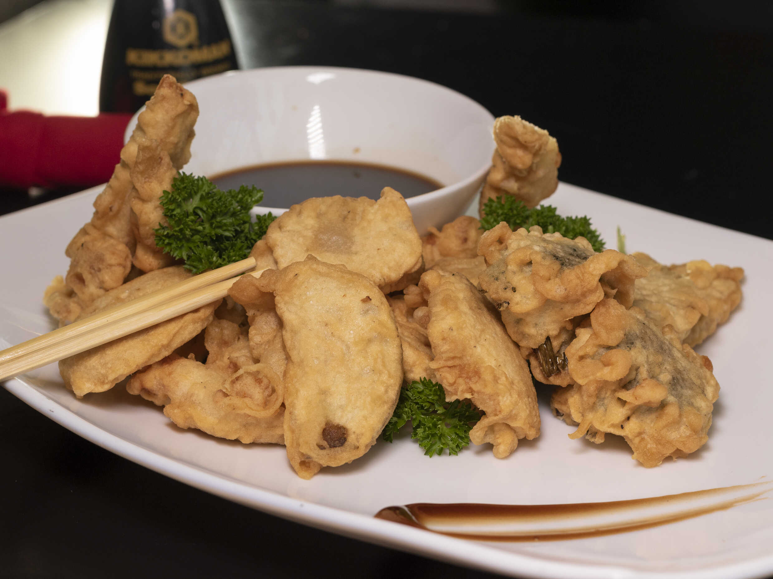 Pollo flambeado en salsa teriyaki, queso crema, cebollino aguacate; con una base de hojuelas tempura y bañado en hongos al estilo yasaitame, wantan y salsa unagi.